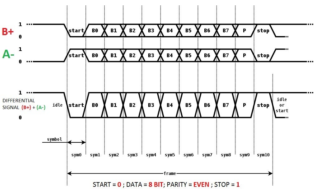 Each byte in a telegram is transferred as 11 bits (START = 0 ; DATA = 8 BIT ; PARITY = EVEN ; STOP = 1), see FRAME FORMAT picture above.