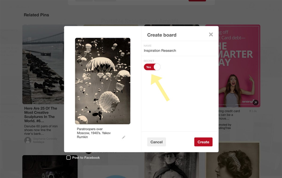NOTE: I highly recommend setting any project boards to 'secret', which means only you can view it and not the rest of the Pinterest community. To do this, just move the toggle under the word 'secret' to 'yes' when creating a board. (see pictured above)