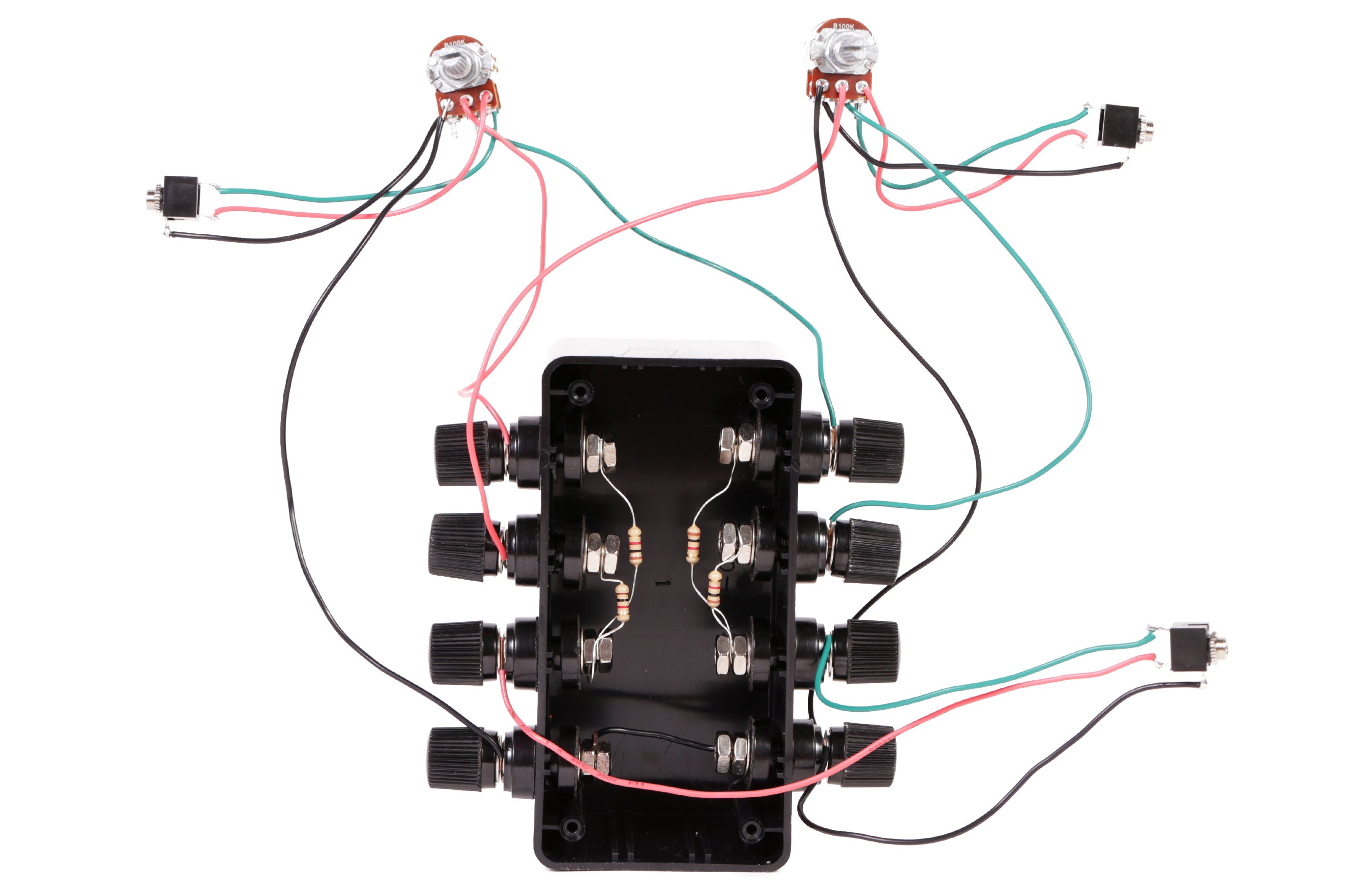 Consider the simplest stereo audio mixer we made earlier that consisted of just four resistors. Imagine the whole thing was placed inside of a black project box, and there were input and output terminals that let us access parts of the circuit.