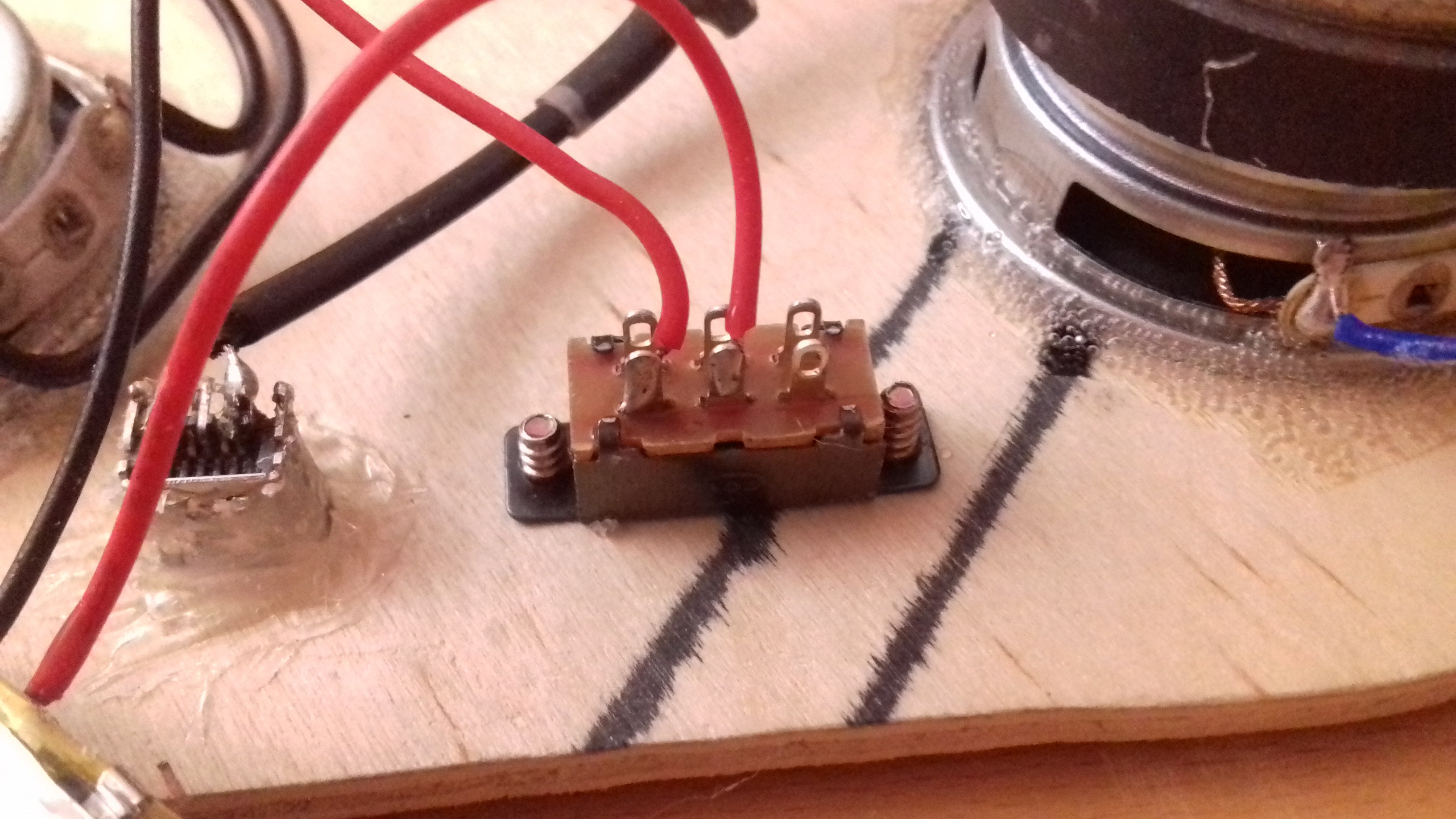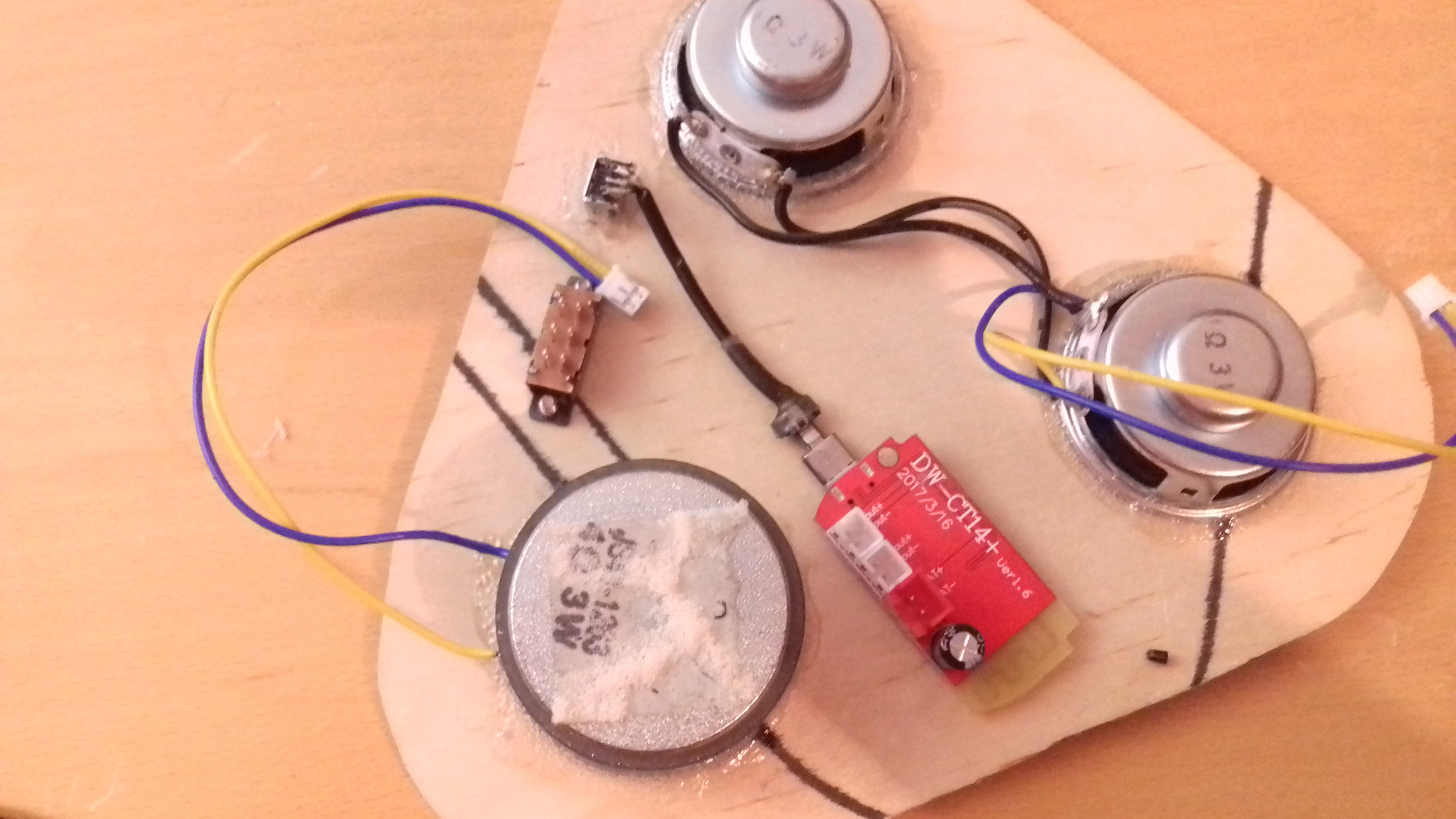 Previously I ordered a couple of 3w speakers, while I had one strong 3w bass speaker laying around. Now, I want to connect that stronger one on one channel, and the other two; connected in parallel; on the second channel. In addition of soldering these connections, I've mounted & screwed down the switch, as well as, glued the miniUSb port. For doing such, first; I used super glue, where he didn't prove so well; which resulted in the assistance of hot glue, a lot of hot glue...