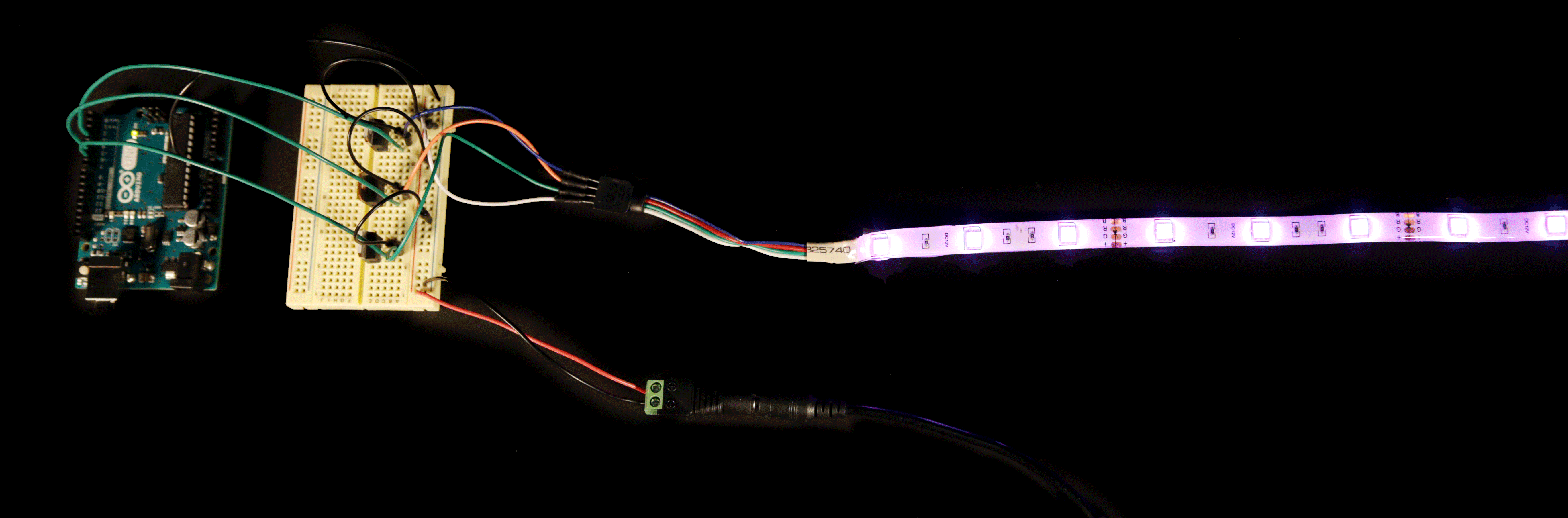 The base of a TIP120 transistor is wired to the I/O pin on the Arduino. By applying voltage to this pin, a proportional voltage is sent through the LED strip.
