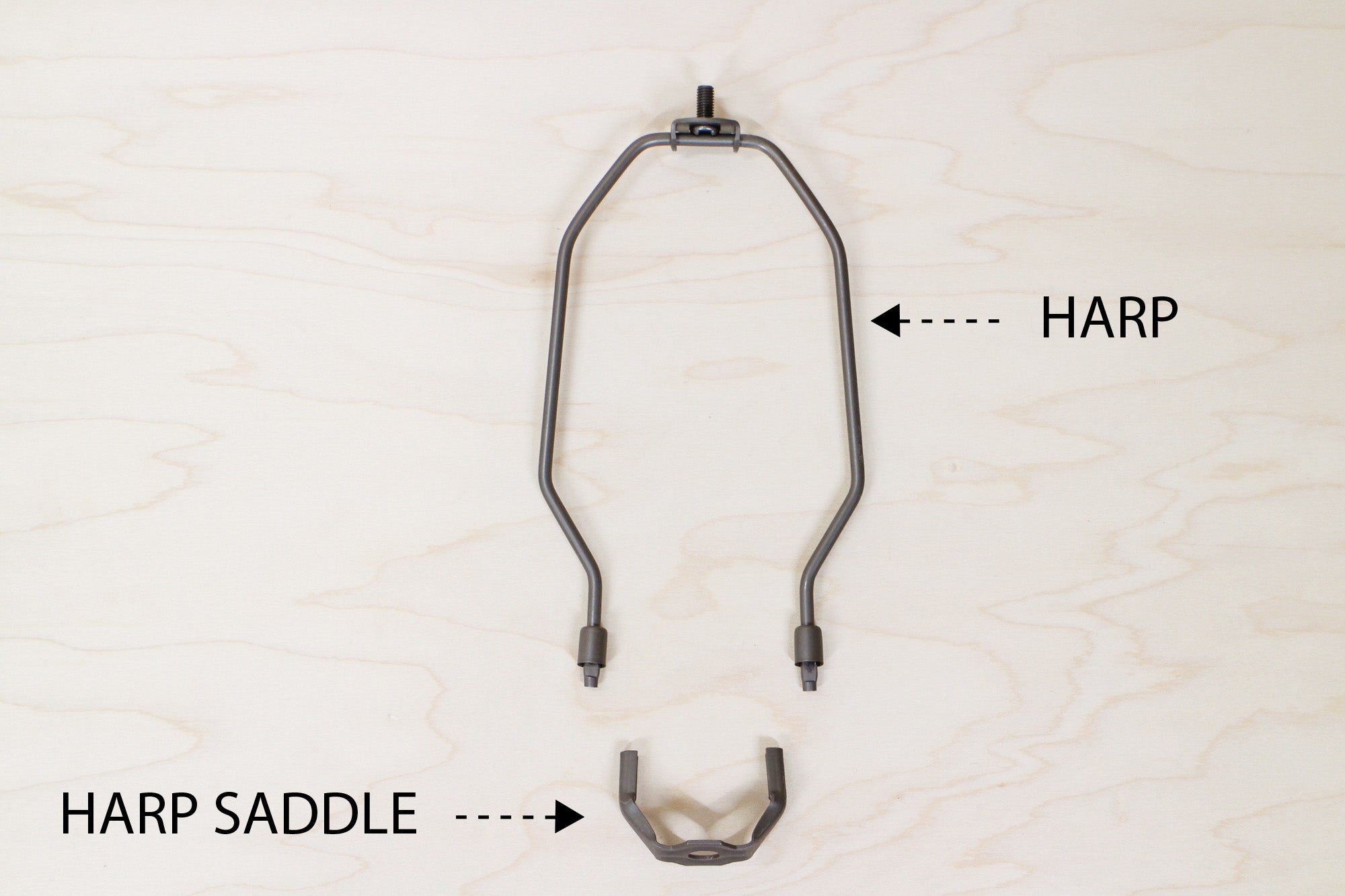 A harp is the most common way that American lamps hold up shades. The harp saddle is built right into the lamp (under the socket cap), while the top is removable. We used harp saddles in every lamp in this lesson except the Bottle Table Lamp. (smaller lamps work best with clip on shades)