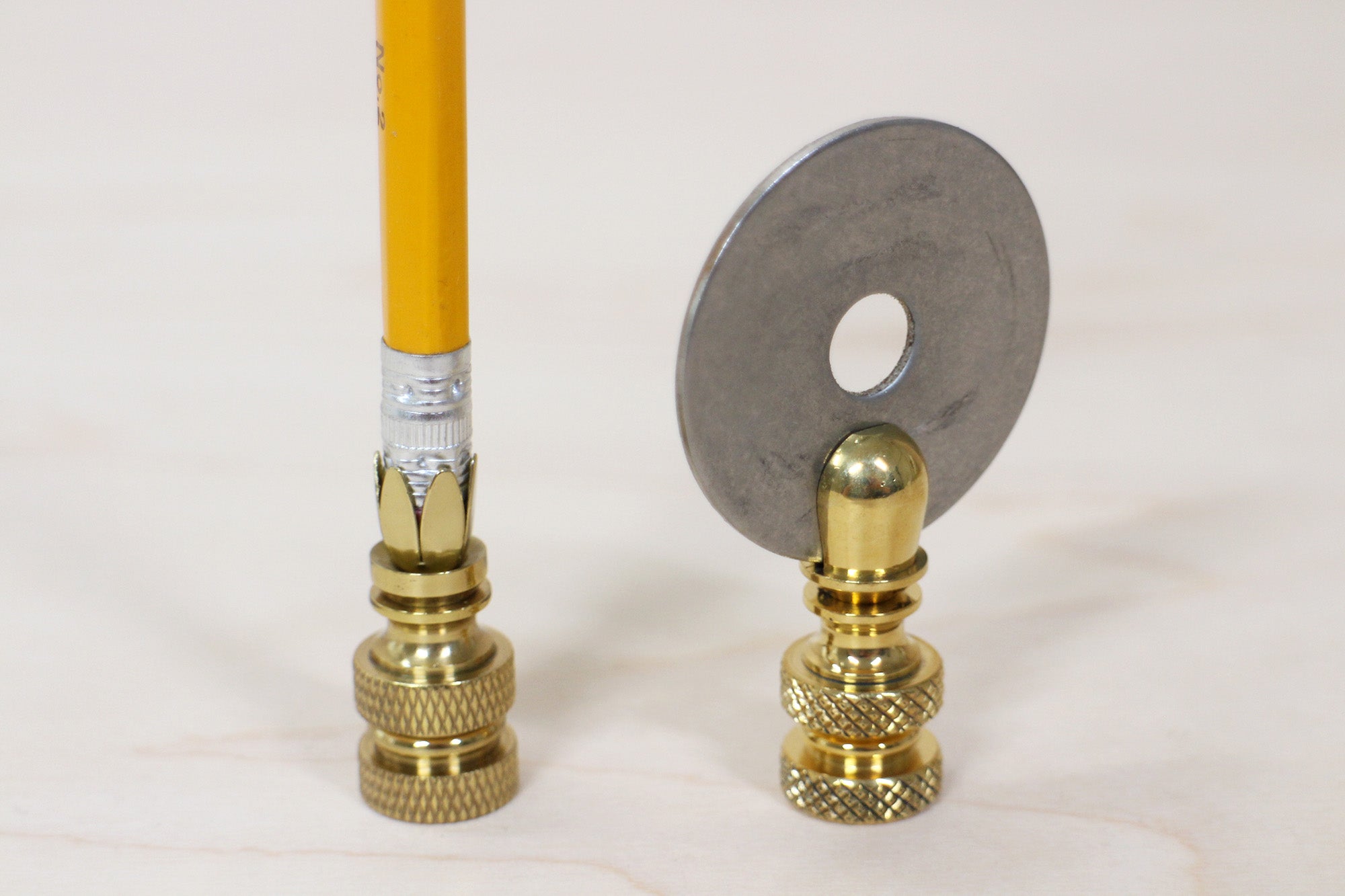 Finials are like the hair pins of lamps - both functional and aesthetic, they secure the shade to the harp or bulb clip. They come in SO MANY shapes, sizes, materials, and metal finishes. I recommend getting fun with these. They are an inexpensive way to add to the style/look of a lamp. Their female threads are 1/4-27F.