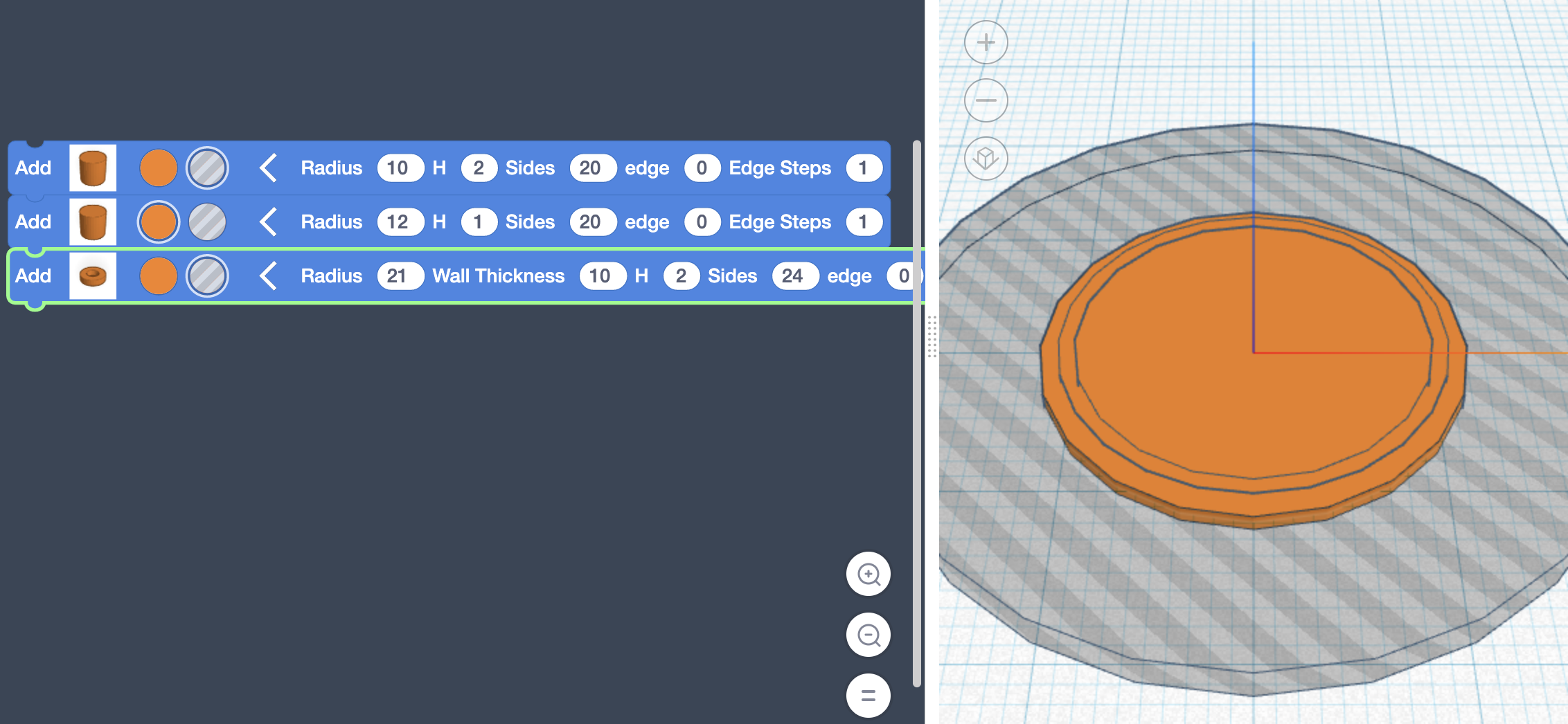 Drag the green (0 + 0) block and place that into the height for the first cylinder, then place the Thickness variable in one of the 0 spots, change the 0 to a 1, and click the plus drop down to change it to multiplication. Height should now be (Thickness * 1).