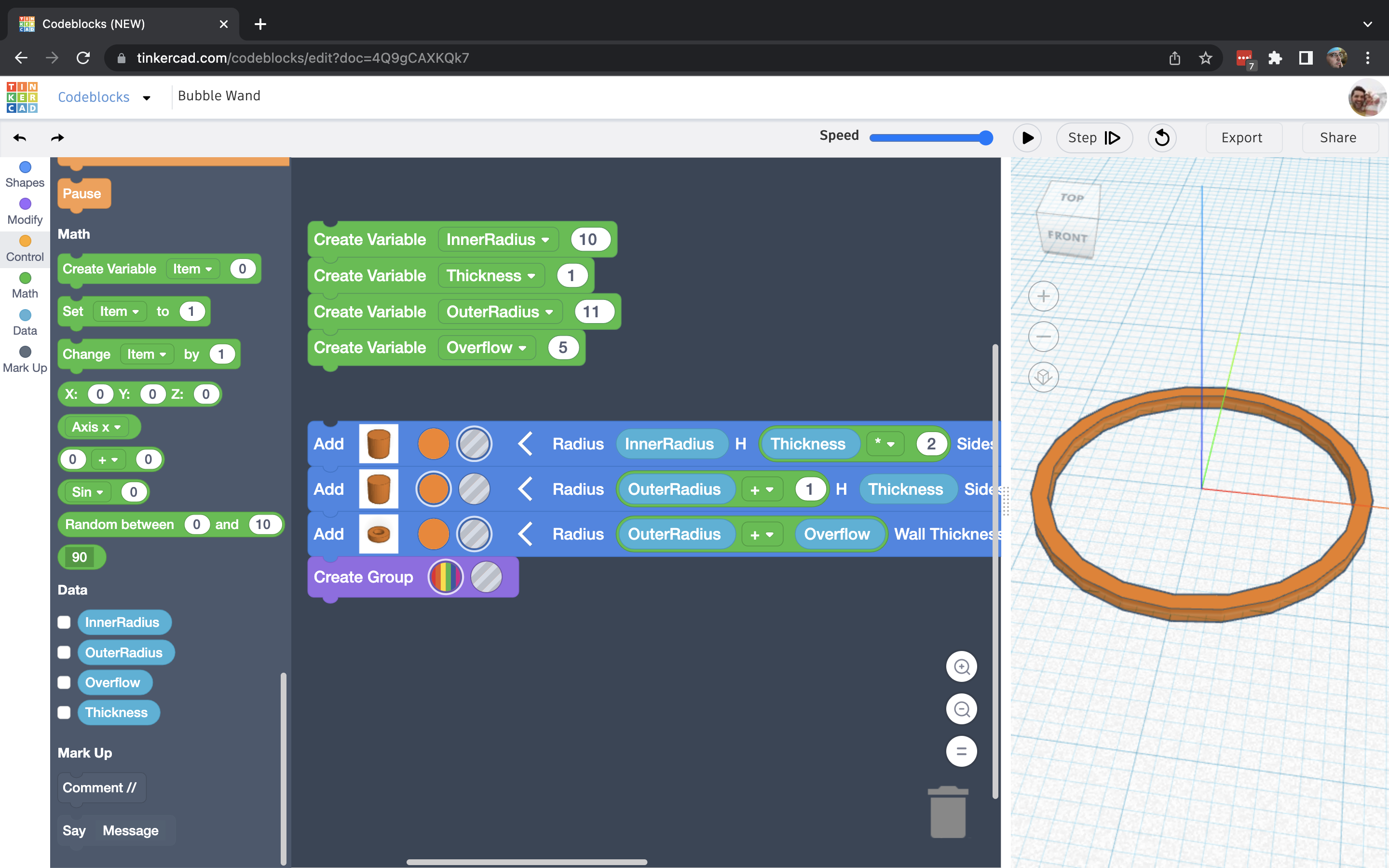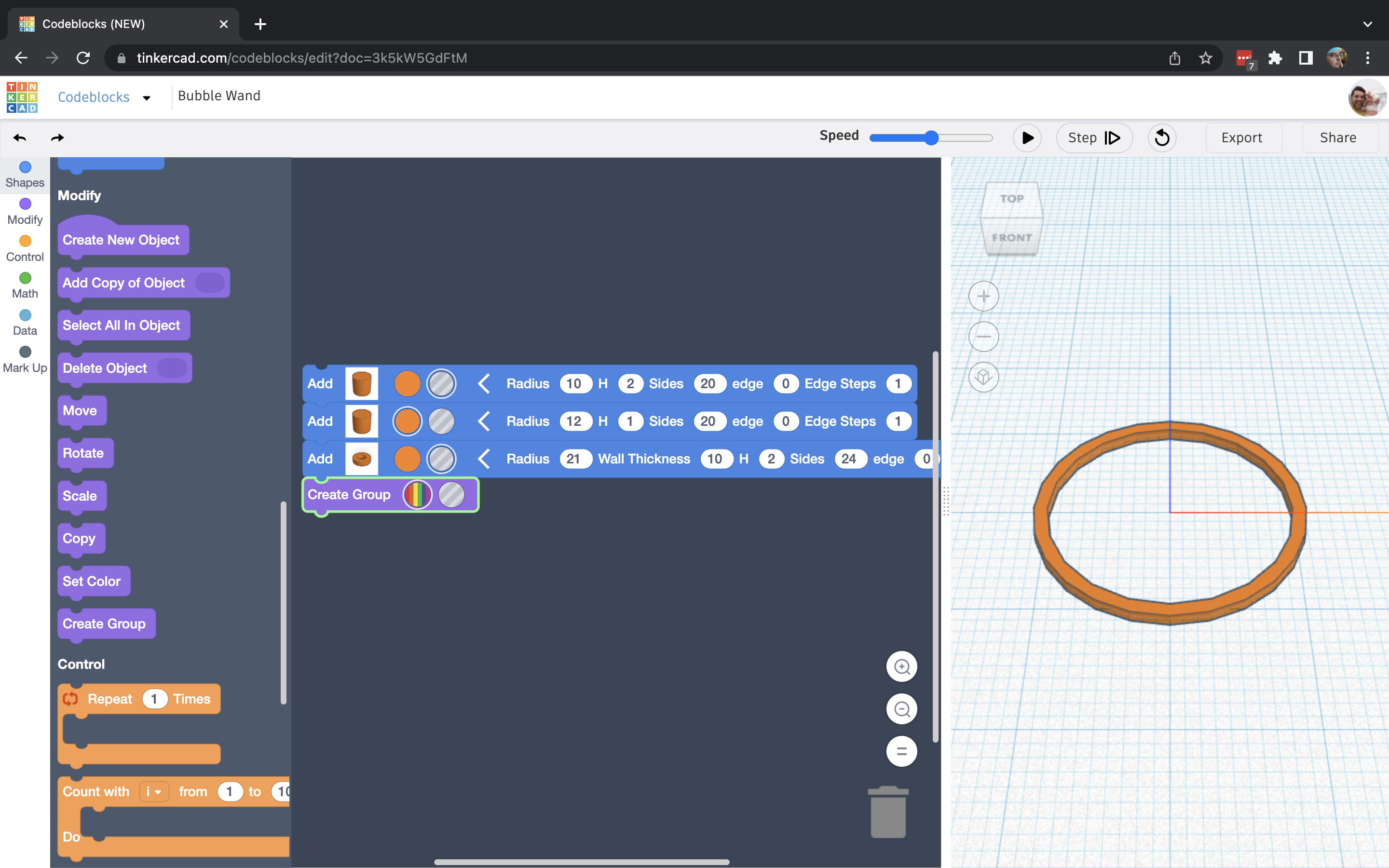 The bubble wands came out really well, and by building connections between variables, it's really simple to make modifictions to test ideas, then revert if needed. When testing against the bubble wand that came with my bubbles, these homemade wands seemed to work better (if not just as good). I'm very happy with the final results and think in the future I might try to come up with a way of doing different shapes.