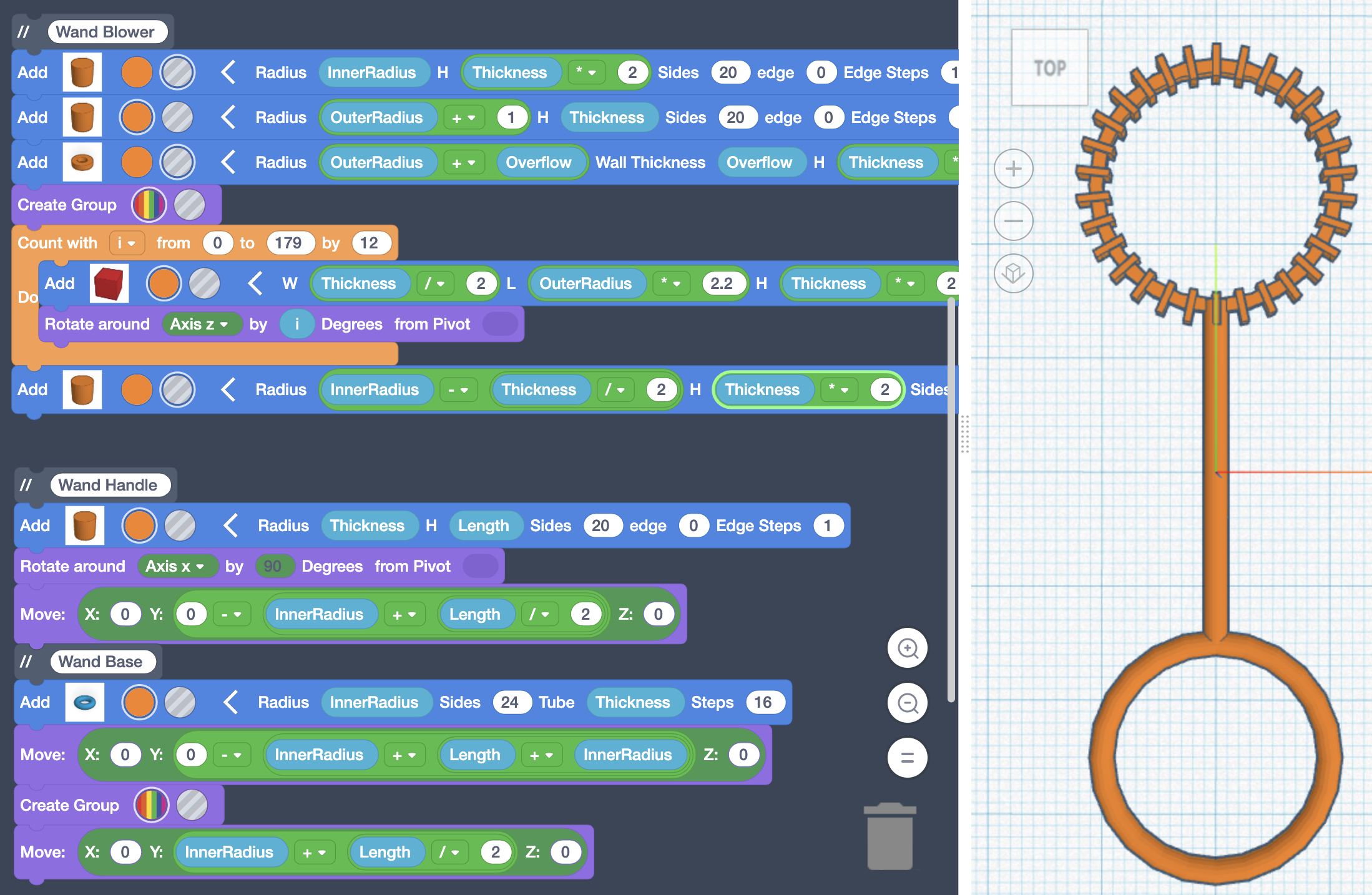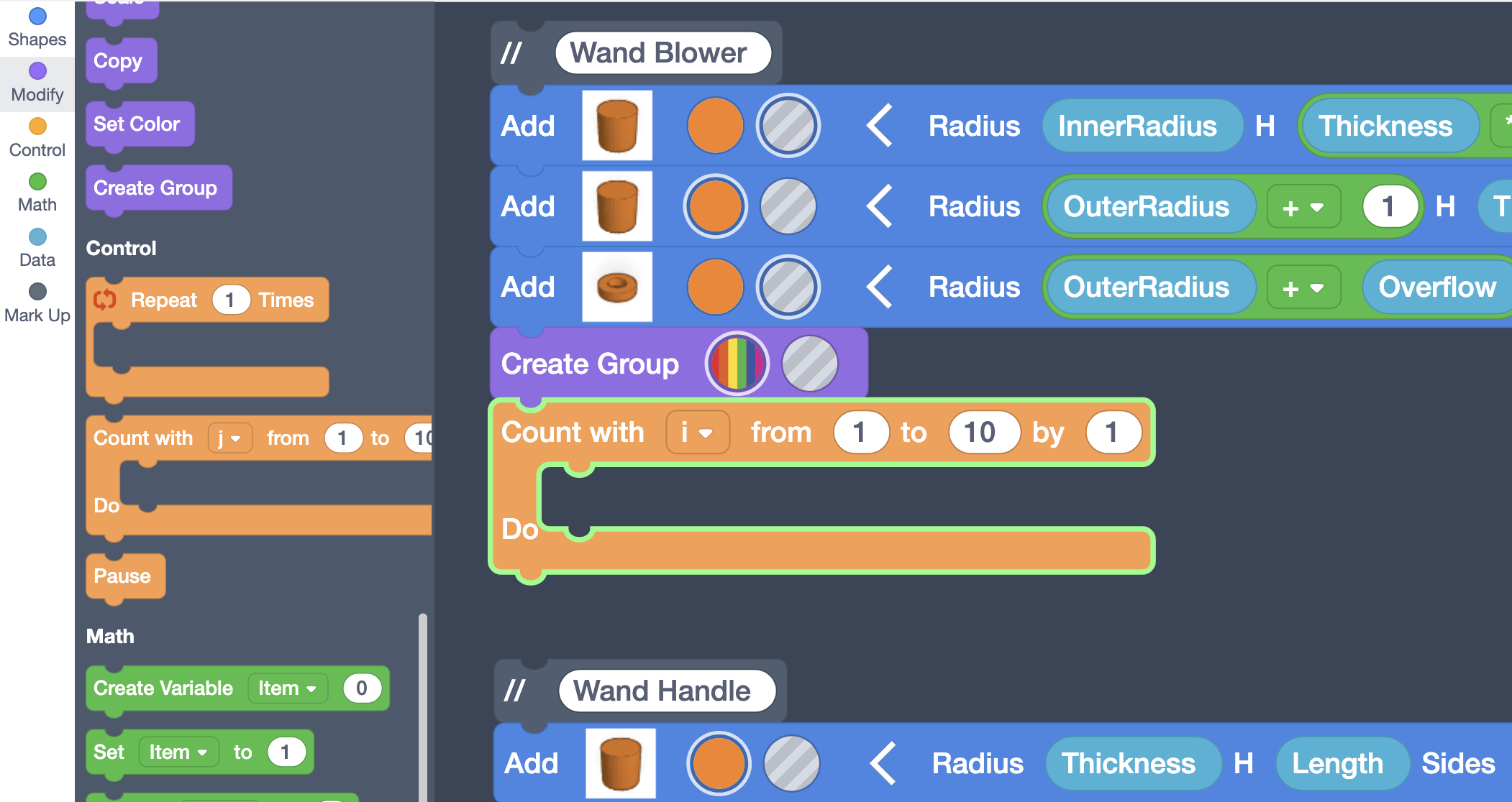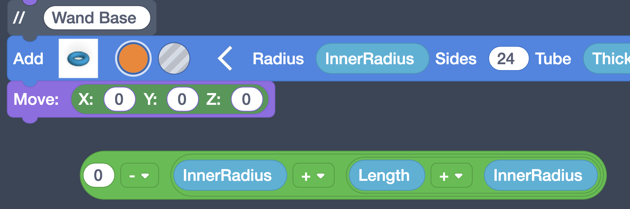 While we could call this a completed bubble wand at this point, if you look at one purchased from the store, you’ll notice ridges around the bubble blower. Since that’s the case, let’s add some to our bubble wand as well. This is going to be part of the Blower section, so click and drag the Wand Holder comment down so there’s a space after the Wand Blower section to add more code.
