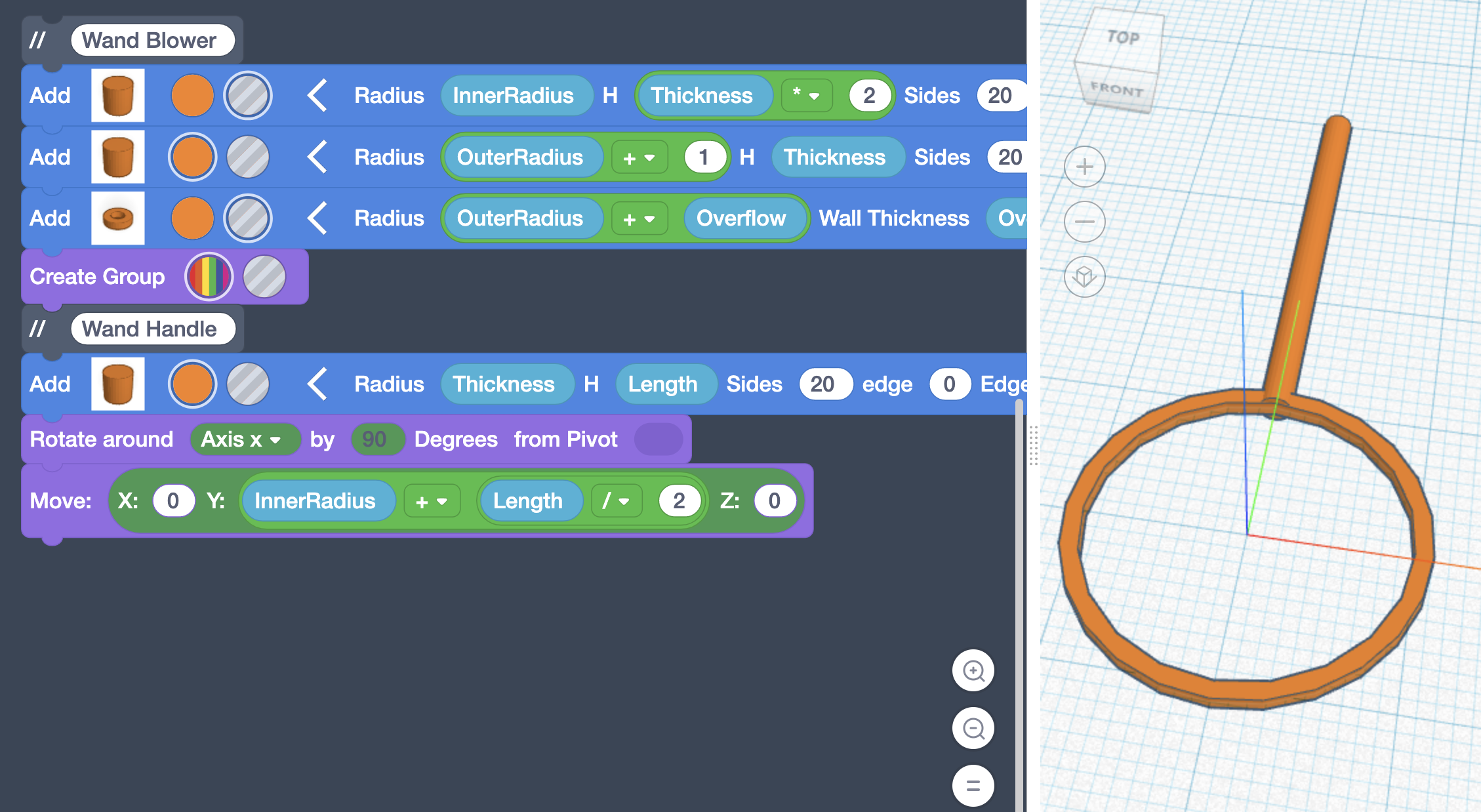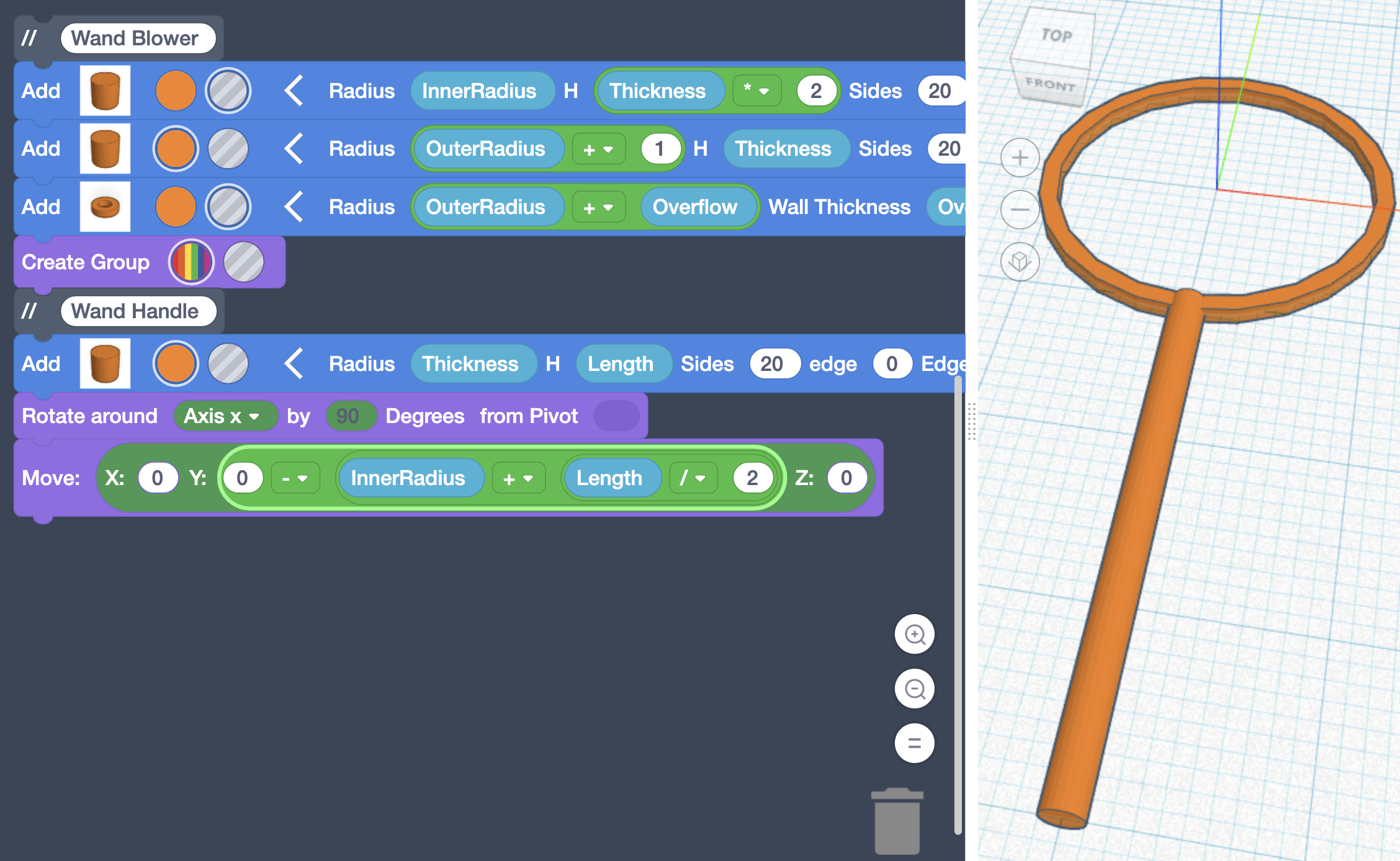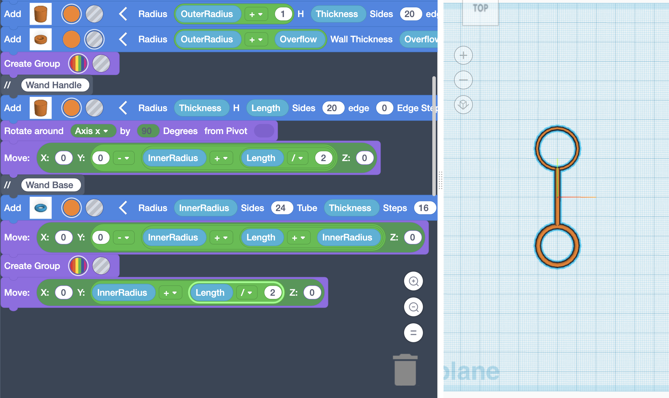 At the center point of your Workplane, x=0, y=0, and z=0. Since we added the equation to the Y value in the previous step, our Wand was placed at the top of our Blower. To shift our wand below our Blower, we can drag in one more (0 + 0), and move our entire equation into the second 0, and change the plus to a minus, resulting in (0 - (InnerRadius + (Length / 2))). This is purely an aesthetic choice as the screen can be rotated as well. Even though it’s aesthetic, ensure you make this modification or the following instructions will not work.