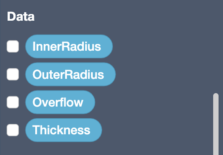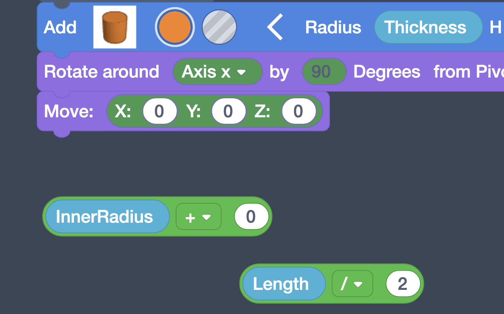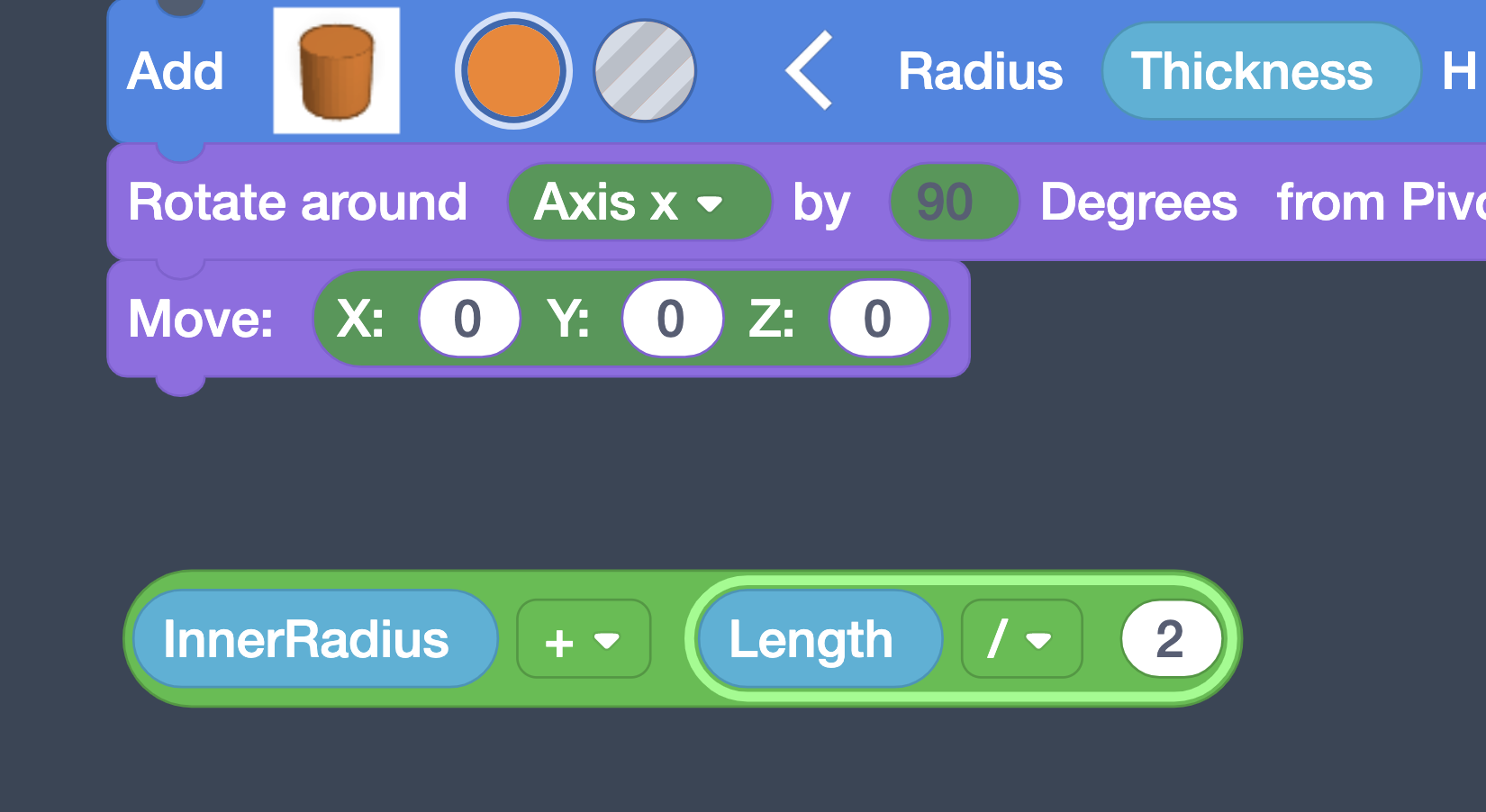 Once the variables are created, you’ll see them at the bottom of the Blocks Panel (blue). Drag out InnerRadius and set that as the Radius for the first Cylinder.