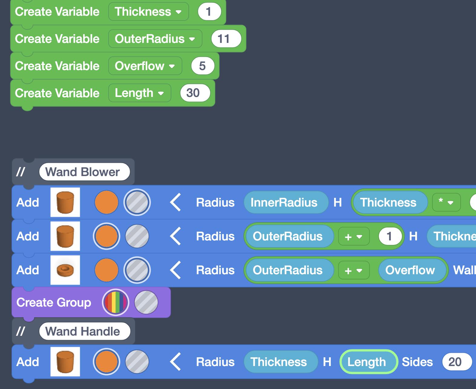 Add two more comments in a similar fashion. Attach one above your first Cylinder and name it Wand Blower. Then attach one at the end of your current code and name it Wand Handle. In the future, when you open this sketch, you’ll be able to easily find the different parts of the code.