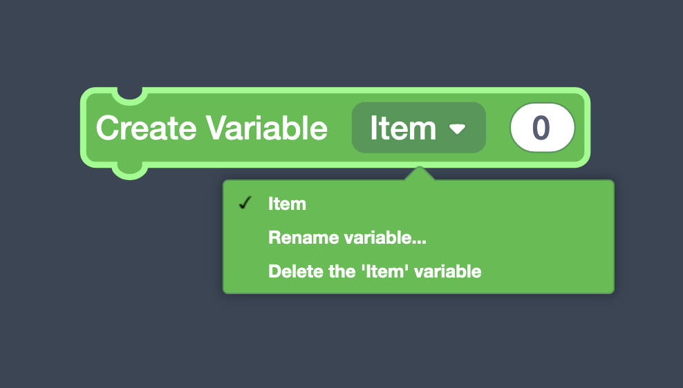 Variables help by allowing us to quickly access values that are going to be used multiple times throughout the project. Scroll in the Blocks Panel to the Math section (green), drag Create Variable above the current code in the Blocks Editor. Variables need to be defined before we use them.