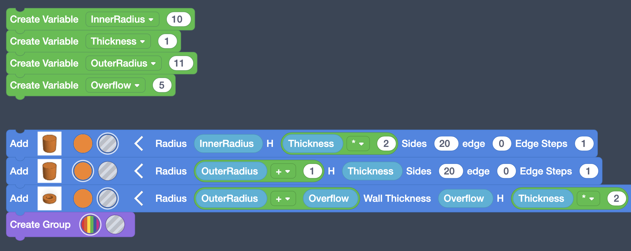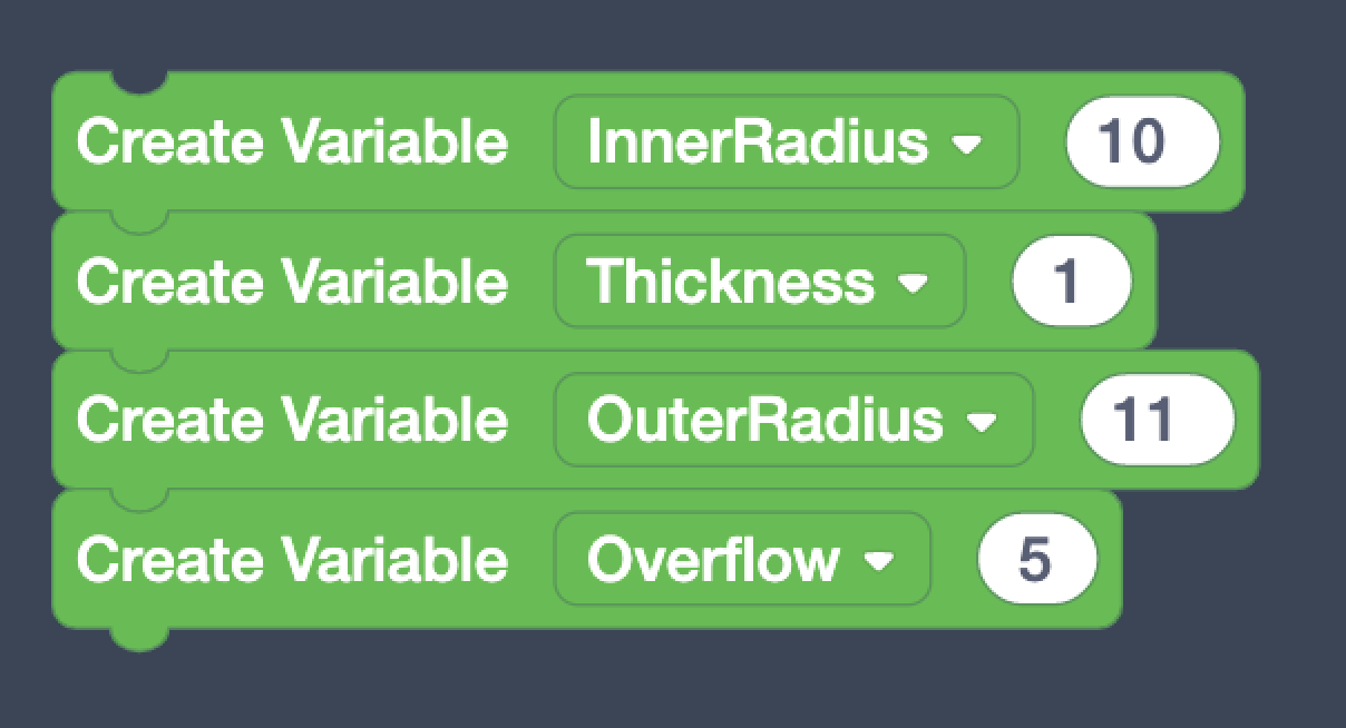 Repeat the previous two steps to add Variables for Thickness (with a value of 1), OuterRadius (11), and Overflow (5).