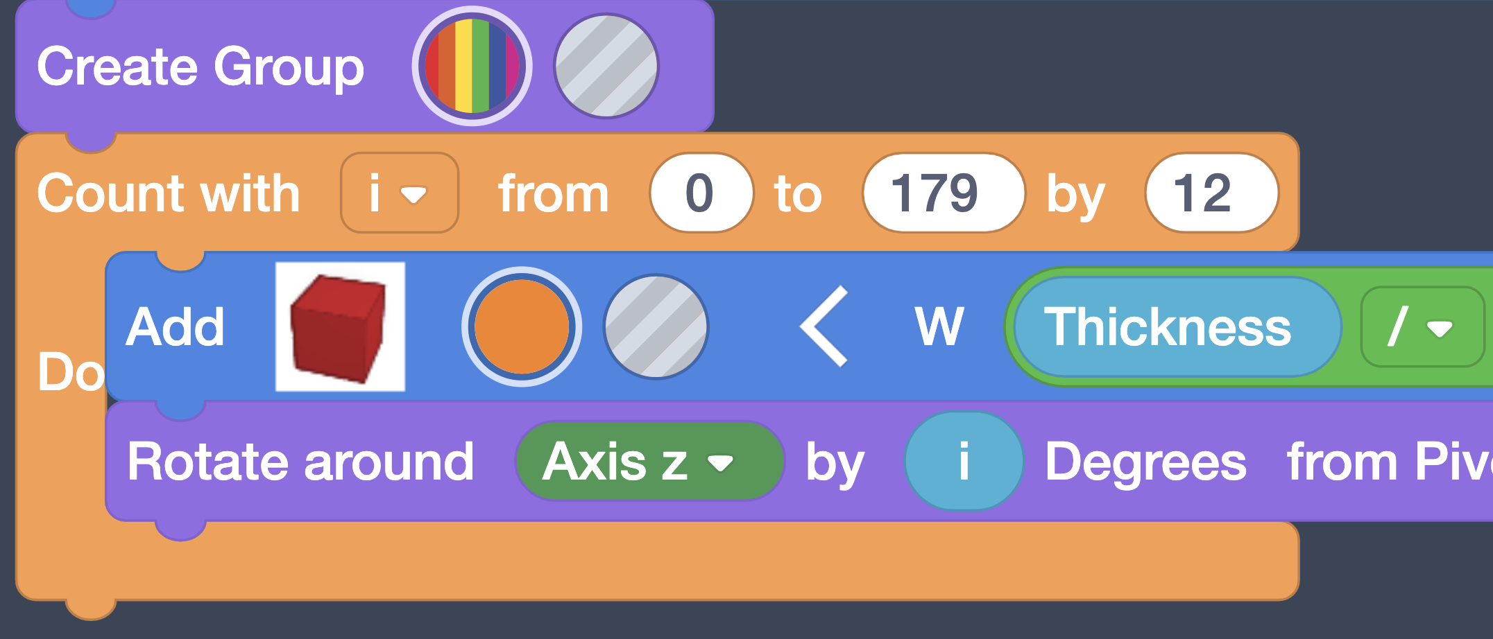 To move everything we’ve placed so far; we need to combine it all together into a single shape. To do that, drag a Create Group block to the end of the current code.
