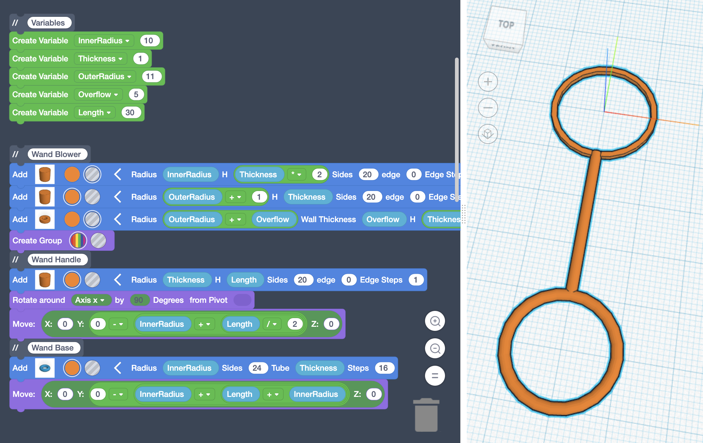Drag a Torus from the Blocks Panel and make the Radius equal (InnerRadius), the Tube equal (Thickness), and change the color so it matches the rest of the wand.