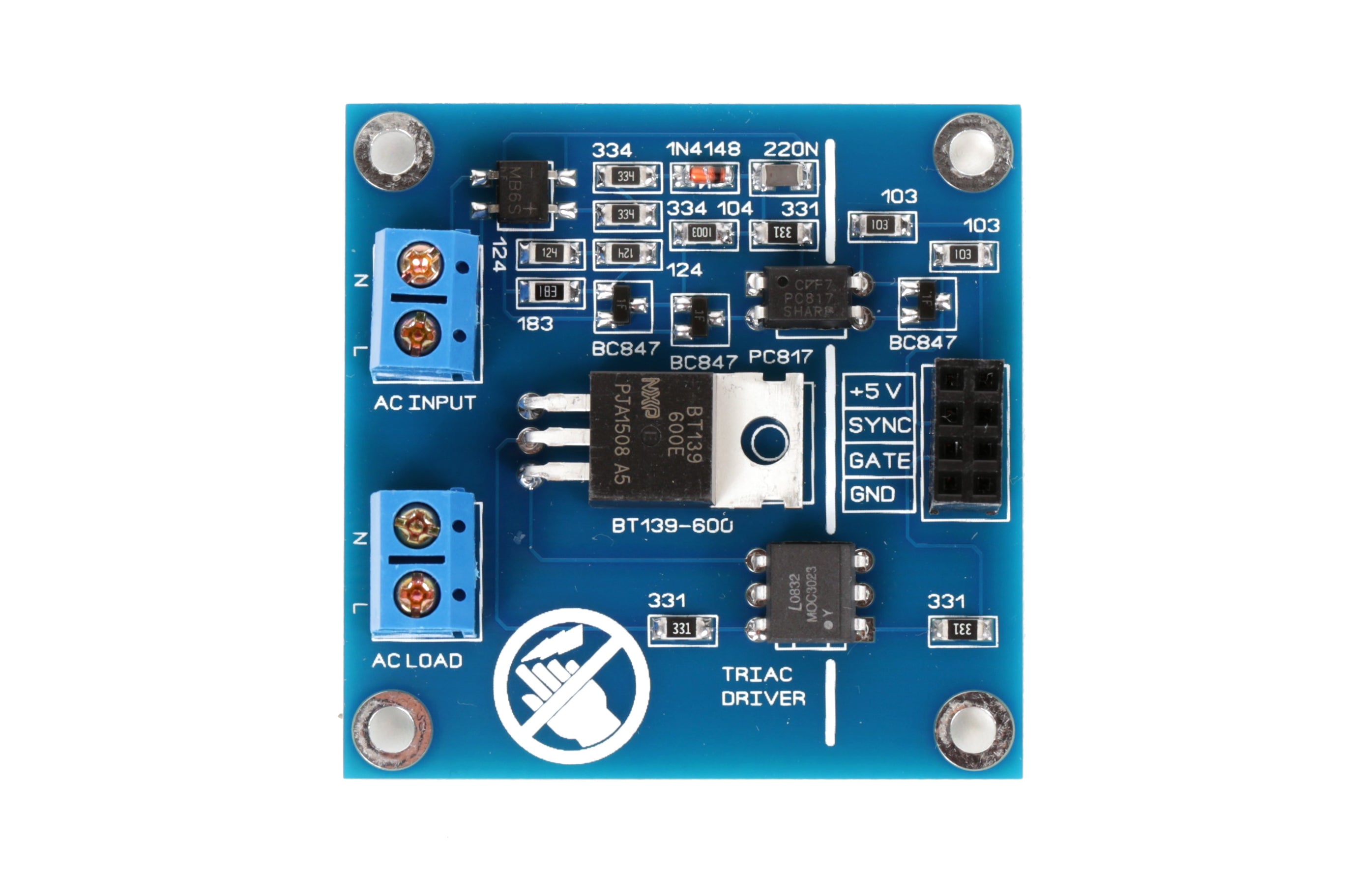 The board has two control pins that are meaningful to us. The first is the Gate pin connected to the "gate" of the triac, which turns the triac on and off. The second pin is the Sync pin, which tells us when the waveform is crossing zero, as it arcs up and down. This is used for timing the AC signal and triggering the triac at the appropriate time.