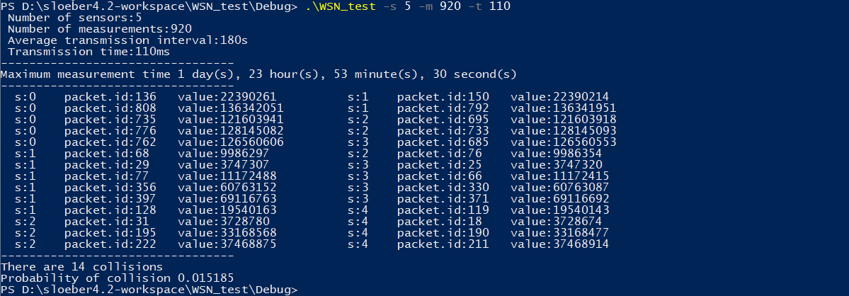 This value, which indicates the likelihood of having 4.35 collisions per 100 measurements is, in my opinion, quite good. The probability could improve if we increase the average transmission time, so at a value of 300s we would have a probability of 0.026332, ie 2.6 collisions per 100 measurements. If we consider that we can expect packet data loss anyway during the system's operation (depending on weather conditions for example) then this number is really excellent.