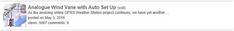 3. Although on first thoughts the wind vane would be easy to code, once the intricacies are explored, it's a lot more complicated. In essence, it's just a very low torque potentiometer, but the problem of getting readings from it is compounded by the fact it has a short 'dead zone' around the north direction. It needs pull down resistors and capacitors to prevent weird readings near north which then cause non linearity in the readings. Also, becuase the readings are polar, normal mean average calculations are not possible and so the more complicated mode needs to be calculated which involves creating a massive array of about 360 numbers! .... And that's not the end of it .... Special consideration has to be made concerning which quadrant the sensor is pointing in as if it is in the quadrant either side of north, the mode has to be treated differently.
