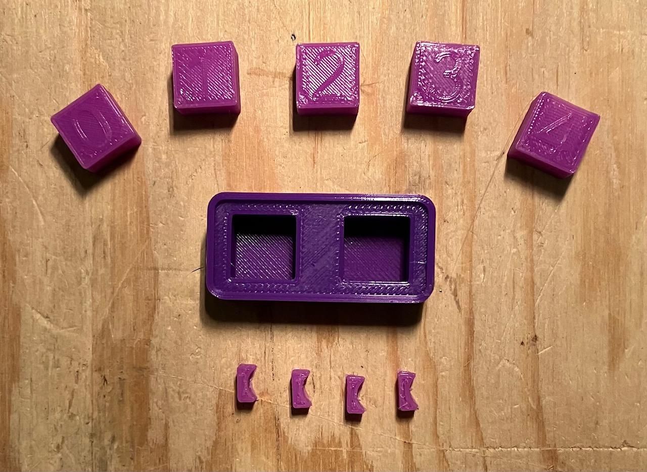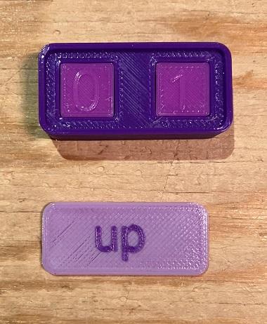 A tile starts with a base (TBM Tile Base). The base has two square "wells" to hold the magnets. I learned through testing that with one magnet and a single linear hall effect sensor, given the thickness of a tile as a constraint and the sensitivity of the sensor, you can reliably differentiate between 10 different tiles. So with two magnets and two sensors I can have 100 unique tiles. You can see the dark violet base below.