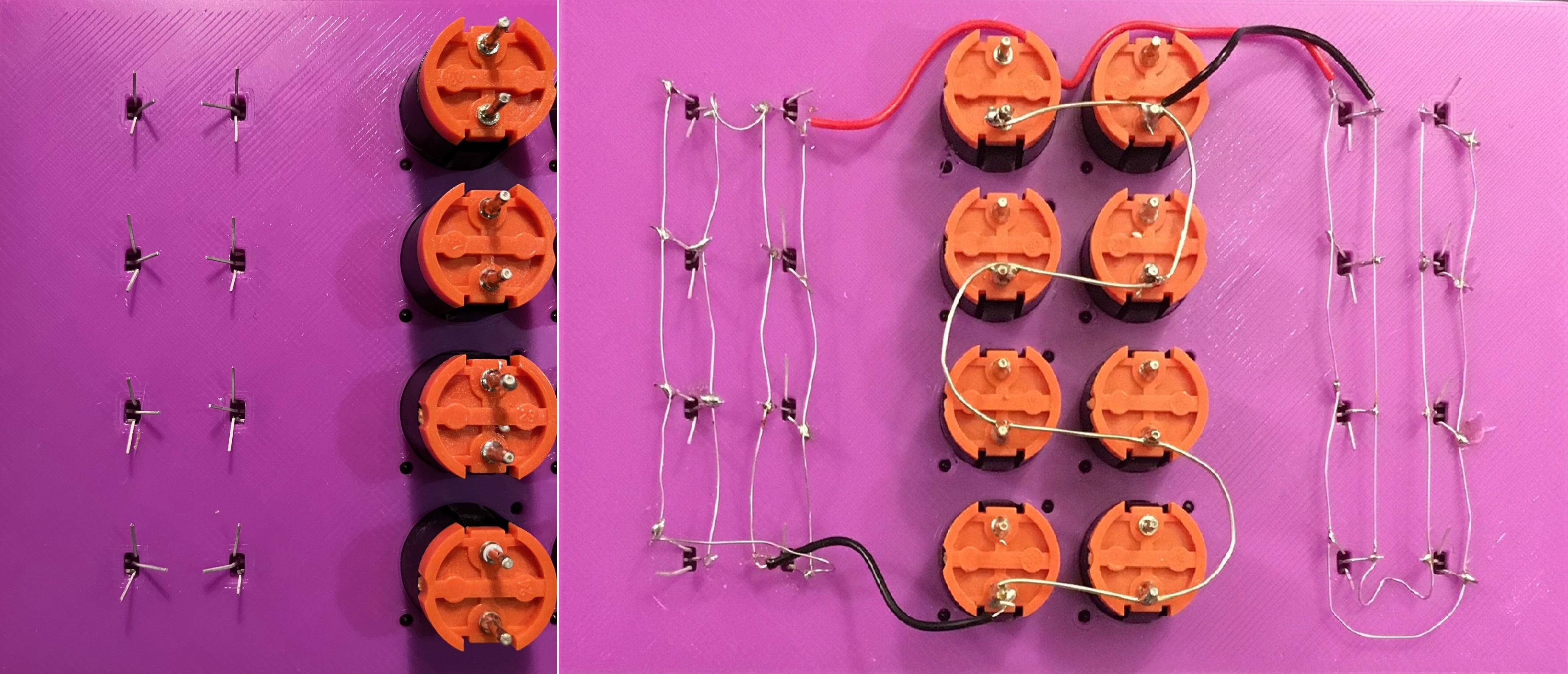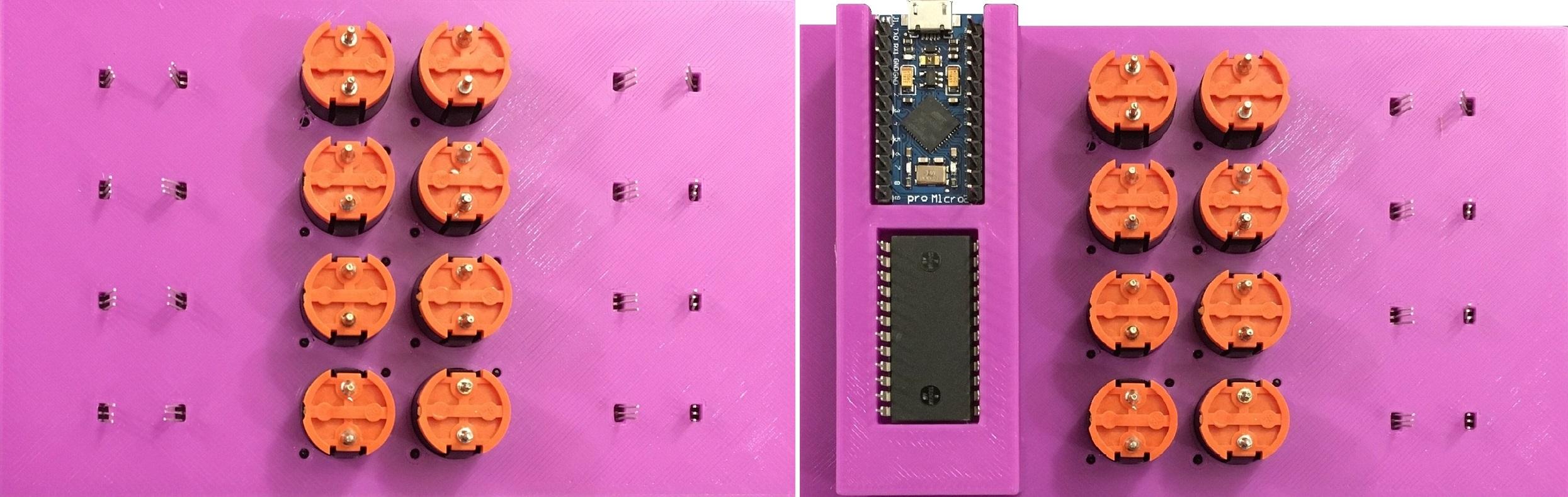 The center panel has holes to mount the eight Fubata MD-4PCS switches. To the left and right are eight tile slots. You can see at the bottom of each slot two indentations to hold SS49E linear hall effect sensors with holes to pass through the sensor's leads.