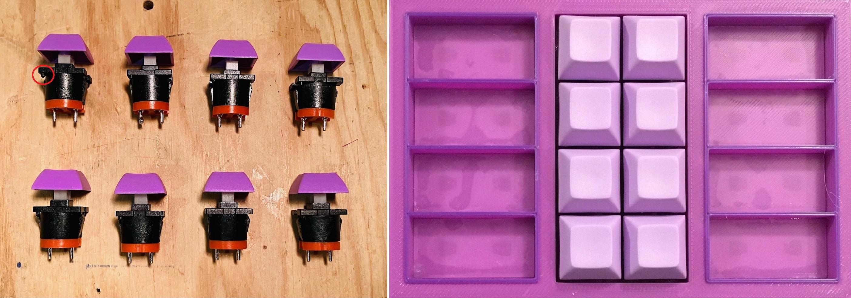 Here is a look at my Fubata MD-4PCS switches which I'm using because I had a bunch from some of my retro computer projects. They are nice and clicky as retro keys should be. Snap in the buttons making sure that the two small studs (one of which is circled in red below) align with the holes in the base.