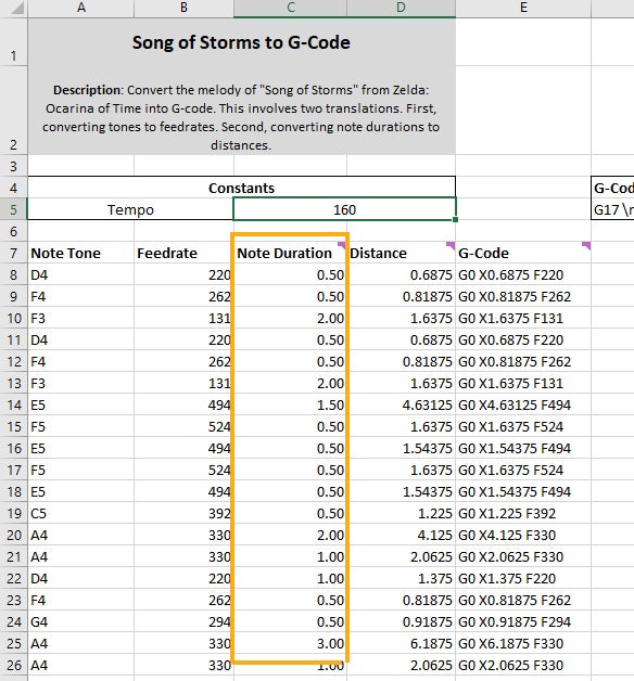 Finally, in the “Note Duration” column, we will ender decimal values that denote the duration for each note: