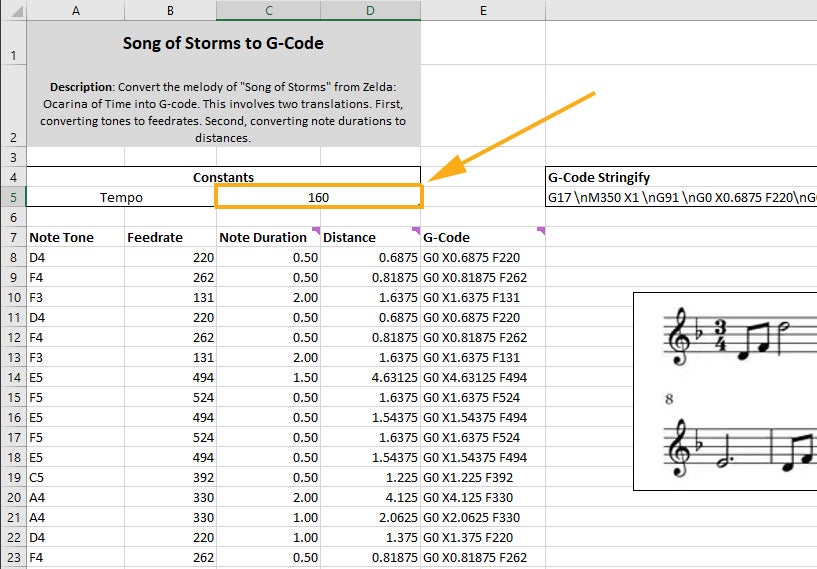 With support for G-code added to VS Code, jump over to the spreadsheet for the song you want to translate to G-code for your 3D printer to play. Copy the stringified G-code from cell F5.