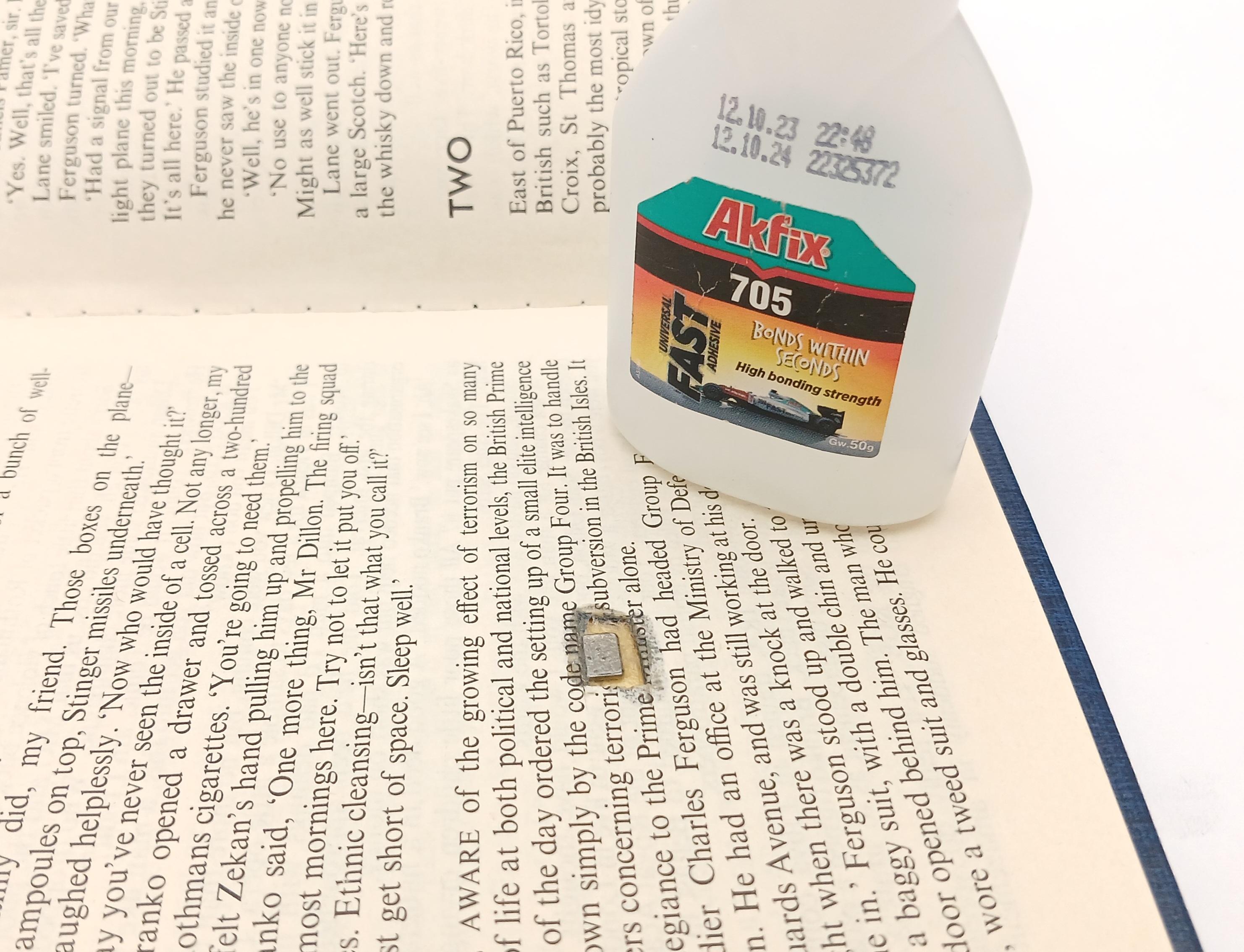 I then positioned the printed enclosure inside of the void and pressed everything together by placing a glass pane on the book (I placed a plastic sheet between the glass and book to prevent the two sticking together) weighed down by an iron ingot.