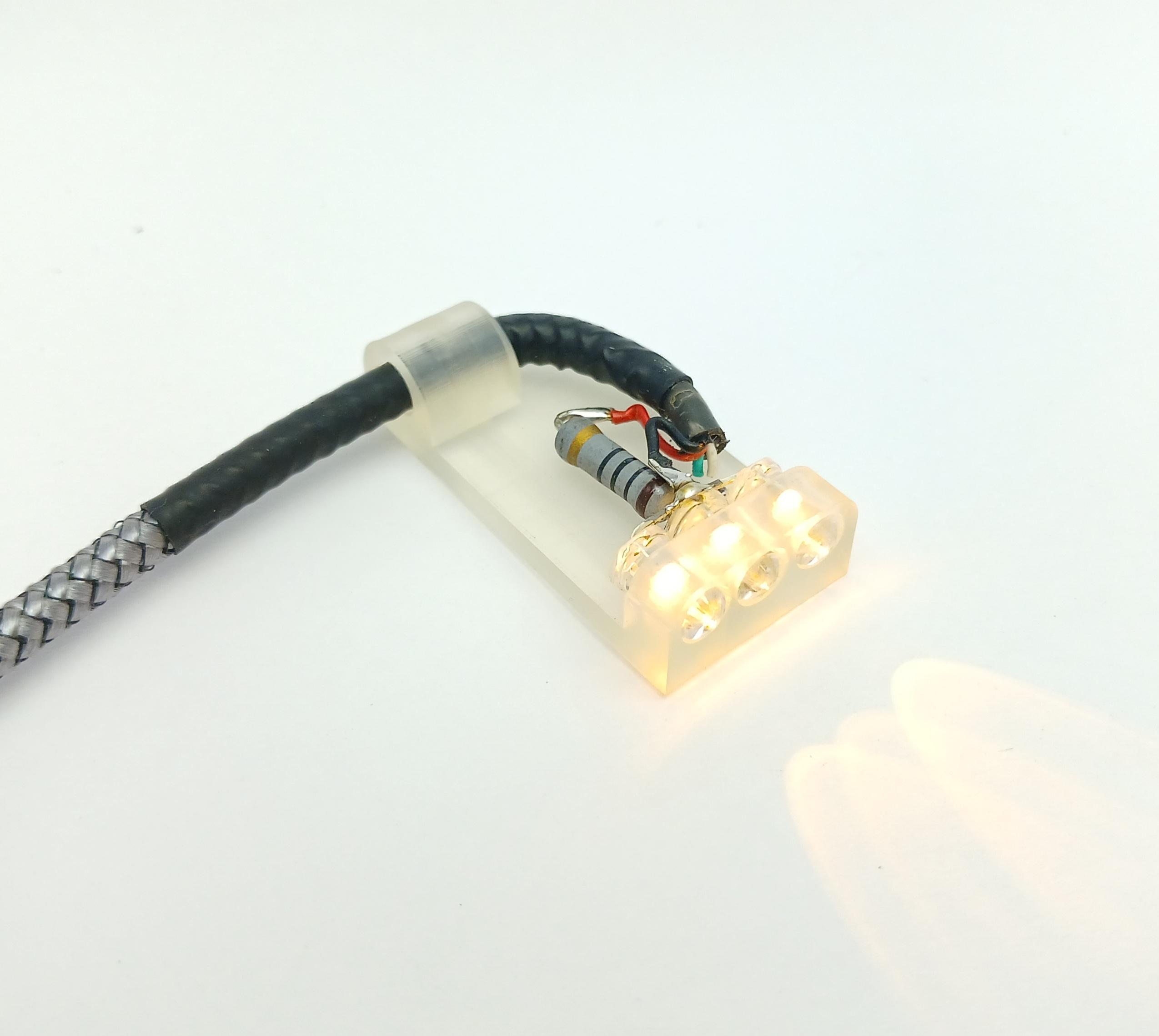 Now we can press the LED's into the holder then feed the USB cable through its support and solder it onto the LED's, red to the resistor and black to the negative leg.