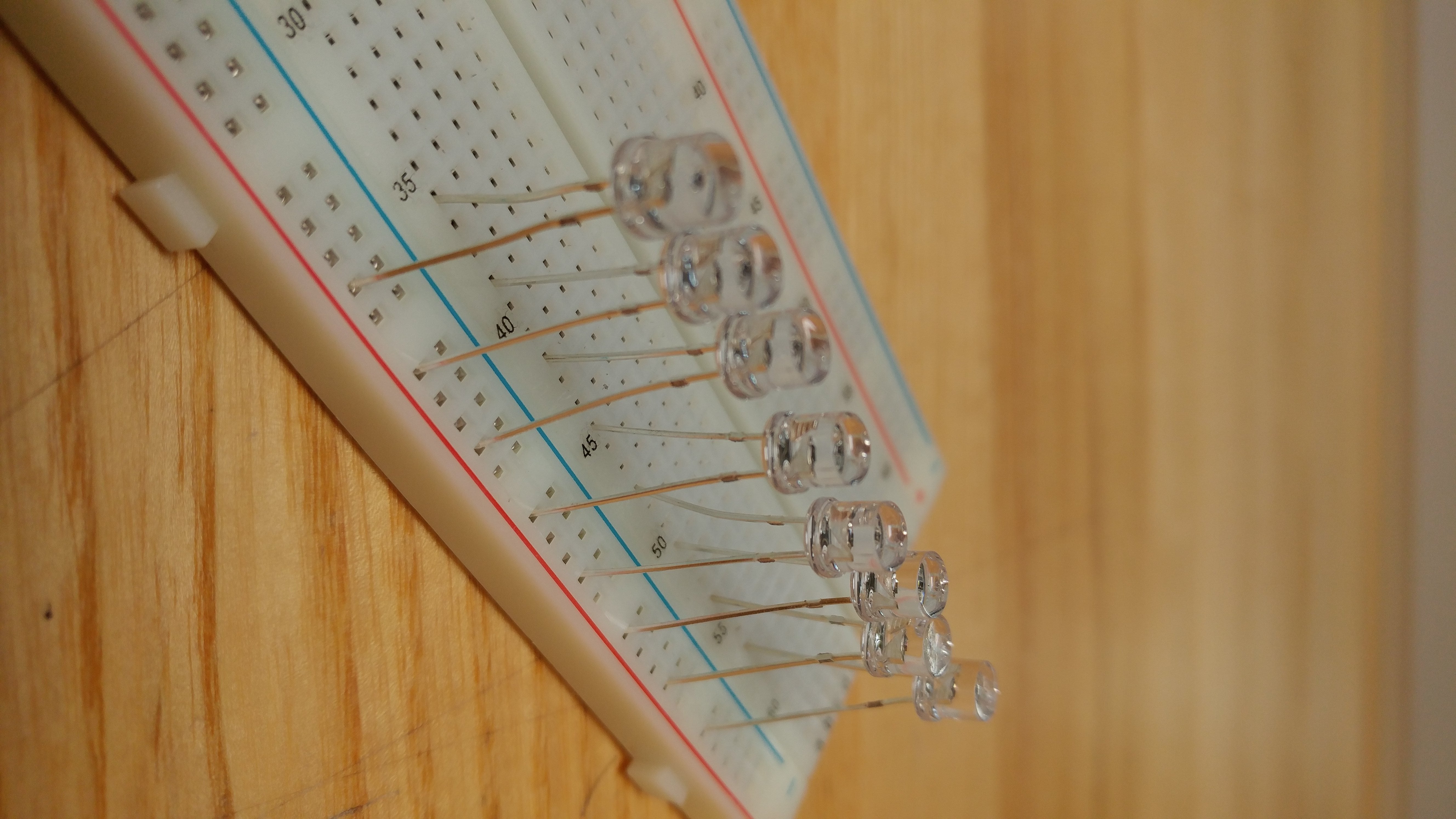 Plug in the phototransistors. The long lead should go into the positive rail. The short end should go into column 57, row a, b, c, d, or e. Put the next phototransistor 3 spots down, there should be two columns in-between every phototransistor.