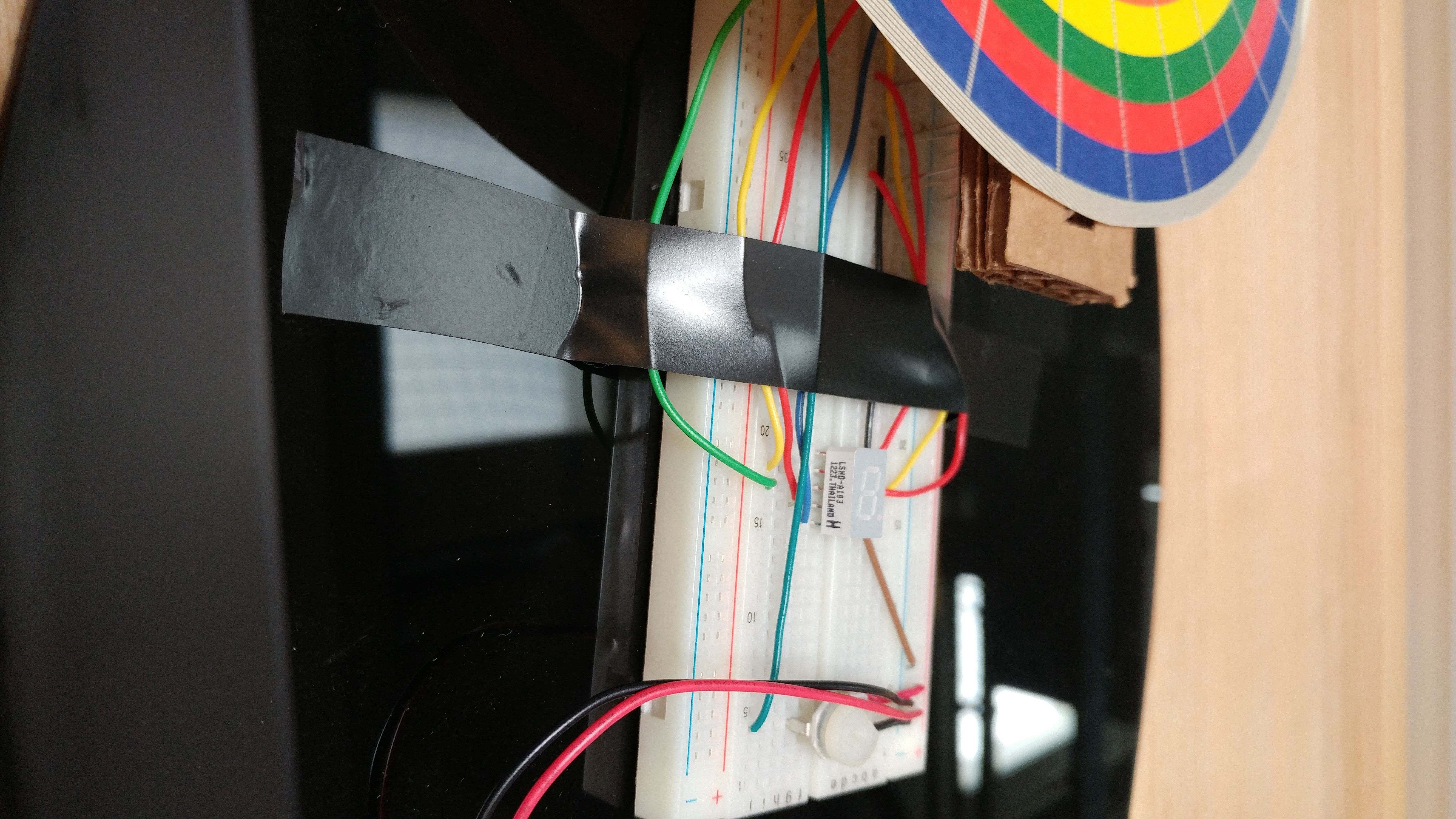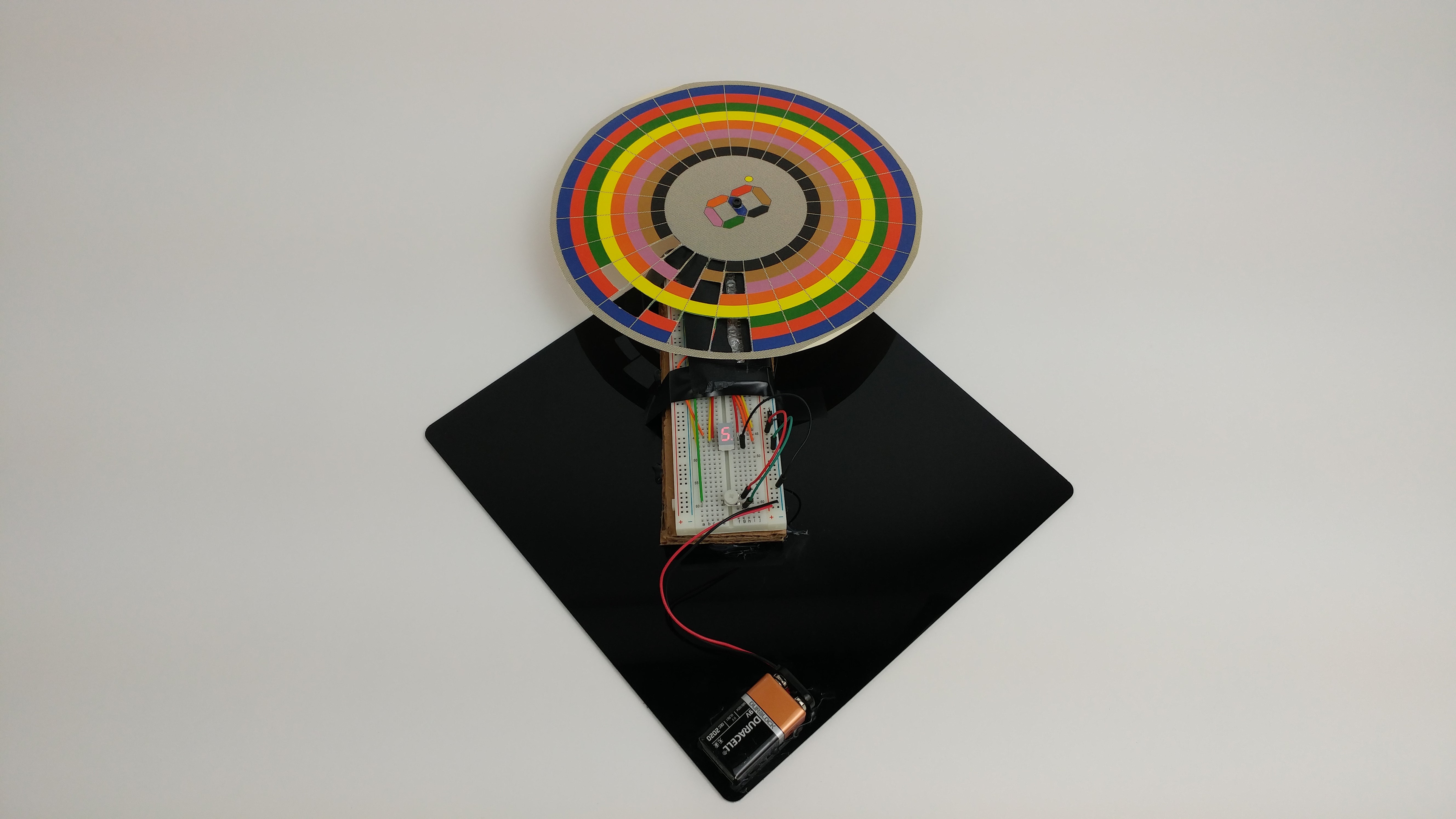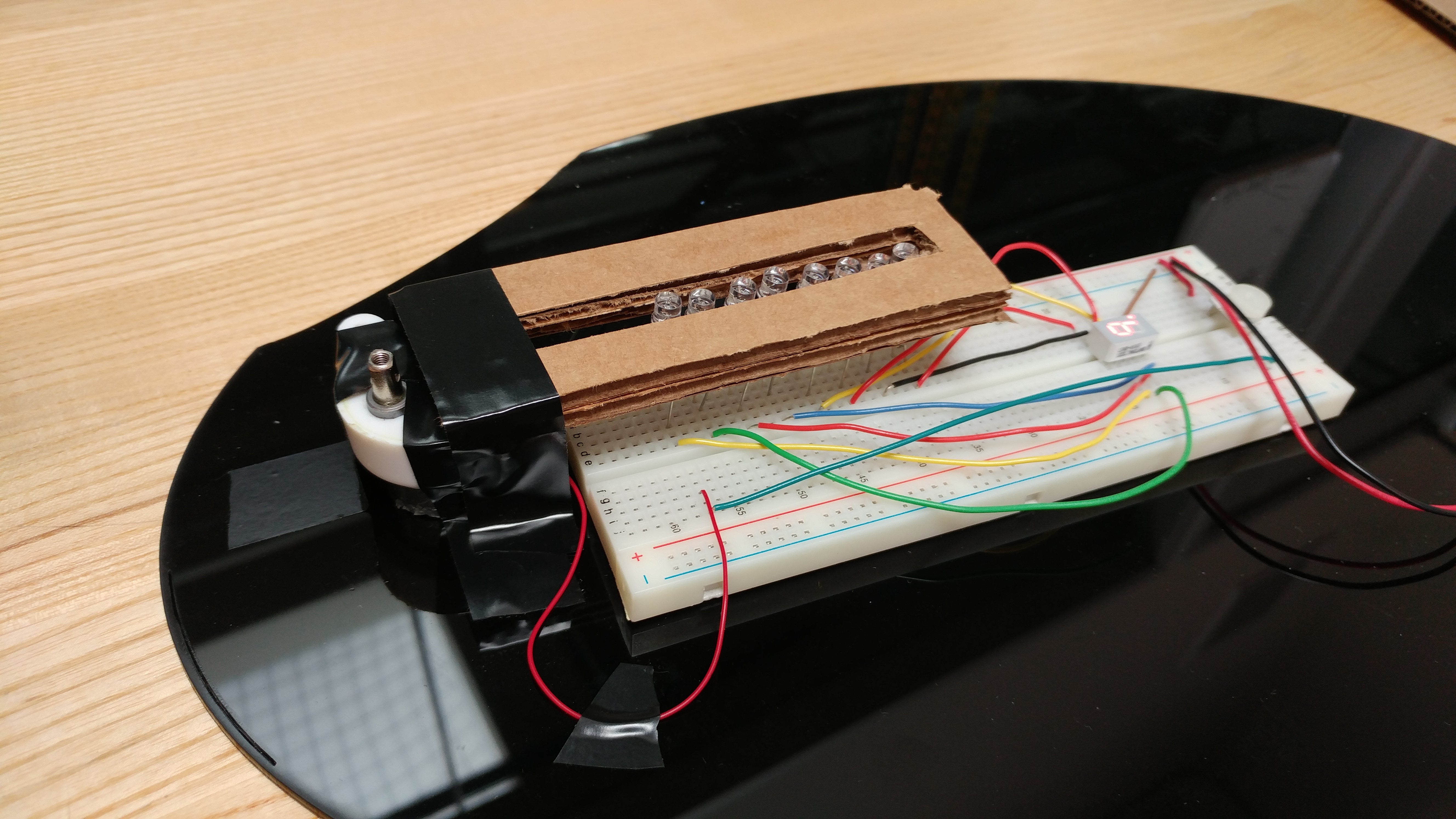 Next you want to put the breadboard and phototransistor array underneath the disk such that the phototransistors line up with the lines/rows of the disk. Once you get them lined up, secure the breadboard to the base.