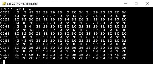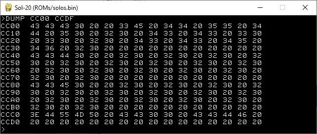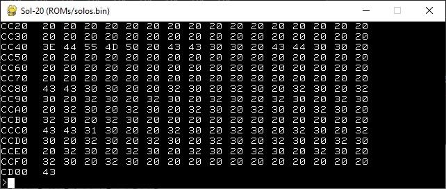 C000-C7FF - System ROM. Sol-20 "Personality Modules" like Solos are mapped here. C800-CBFF - System RAM. Reserved by the system. CC00-CFFF - Display RAM. Shared memory between the CPU and VDM-1 video circuit.