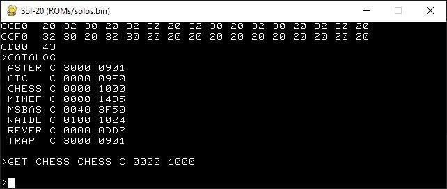 With just keyboard and display you can view and enter values into memory but not much else. I guess you could hand assemble a program, enter it into memory, then execute it were you so inclined. But to be truly useful and interesting you need the ability to load and save programs. The Sol-20 and Solos had built in support for two cassette tape drives. I have mentioned Jim Battle's excellent Solace Virtual Tape Drive and it's faithful reproduction of the cassette tape experience. My goal here is not nearly as lofty. At least initially I just want to support the Solos commands for loading (GET), saving (SAVE) and listing (CATALOG) "files" from "tape".