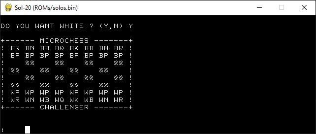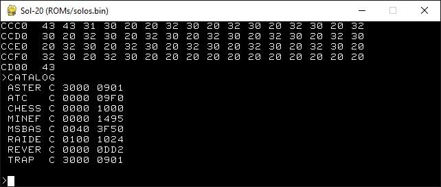 A little more interesting. But something is missing. There is no cursor. It turns out that the Sol-20 marks the cursor position on the screen by setting the high bit of the character the cursor is on. The video hardware on the original machine uses this bit indicator to inverse the character at that position (black character on white background) and optionally blinking that character. I added a cursor by doubling the size of my character table with the characters 0-127 as normal white on black background characters and the corresponding characters in the 128-255 range as inverted black on white background characters. This gets me the block cursor that I want. I'm leaving the blinking part as an exercise for future me.
