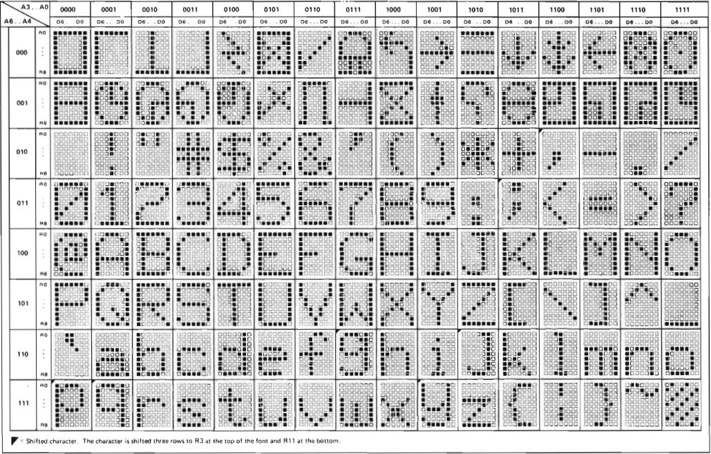 So based on the original Sol-20 6574 character ROM I created a set of character tiles that I could easily "blit" to the screen. I wrote a function to iterate over the 64 x 16 array of characters in the shared video memory and write them out to the screen and added this function to the main loop of my emulator. When I did that I was rewarded with this. I know the aspect ratio is off here. I'll deal with that later.