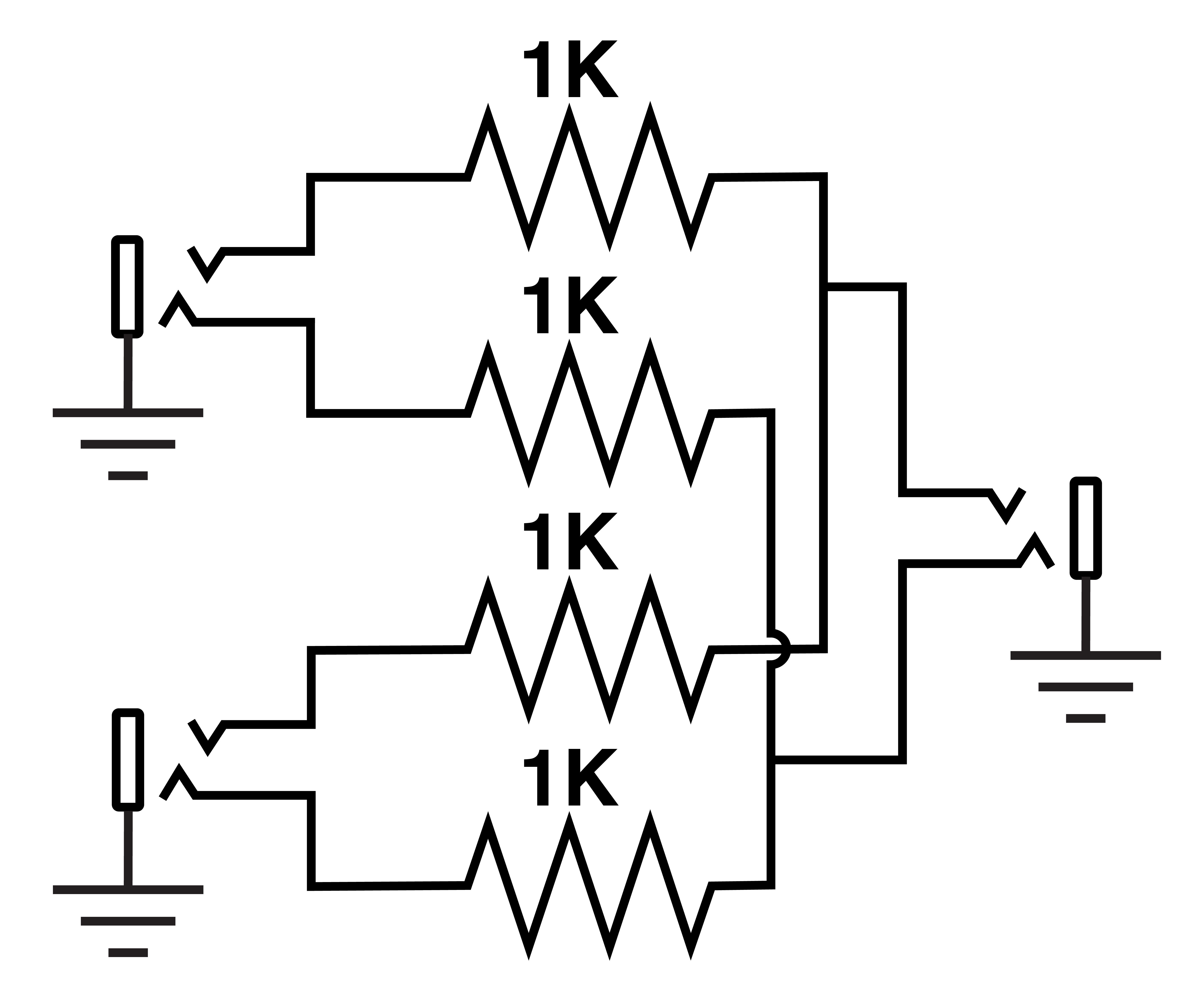 Keep in mind, this is one way to make a mixer using resistors, but not the best way to make one. The resistors result in some loss of volume. This is particularly problematic if you decided to build one with more tracks.