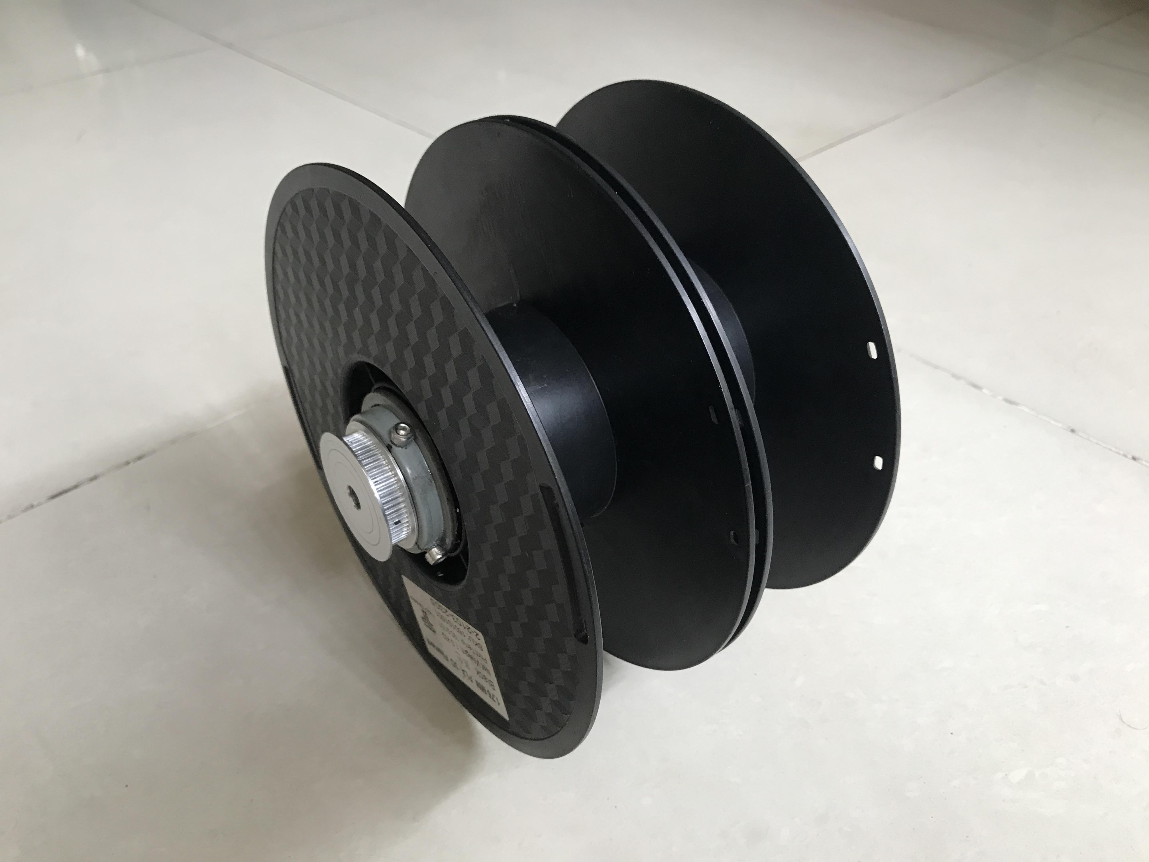 I made another one similar to this, with only 1 small filament spool for this project. My winder was driven by 2 steppers motors via GT2 6mm closed timing belts 400mm and pulley ratio 16:80.
