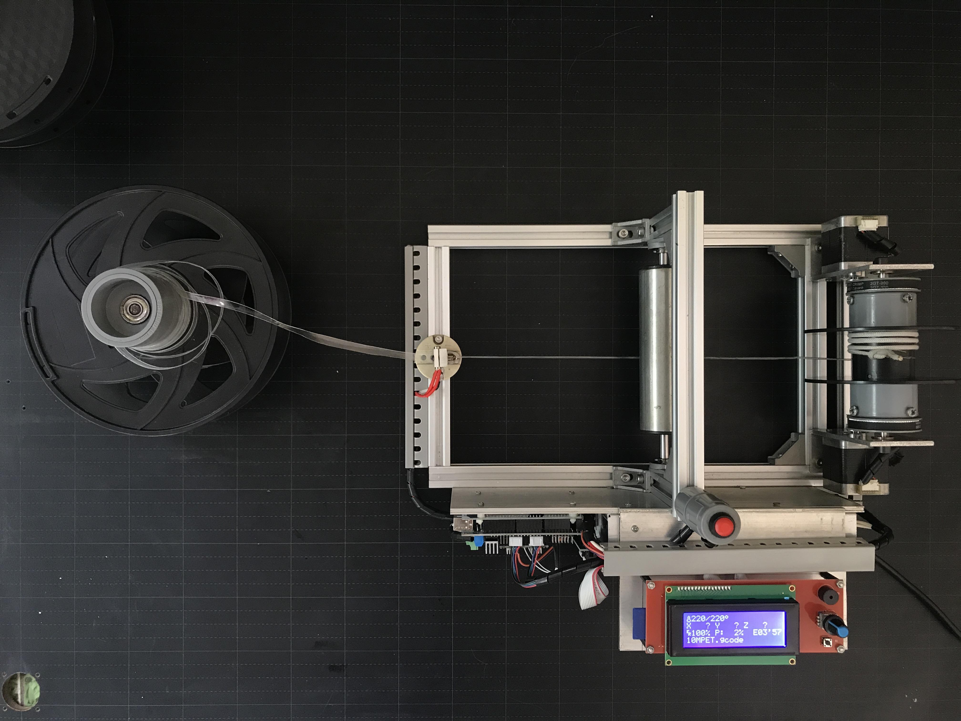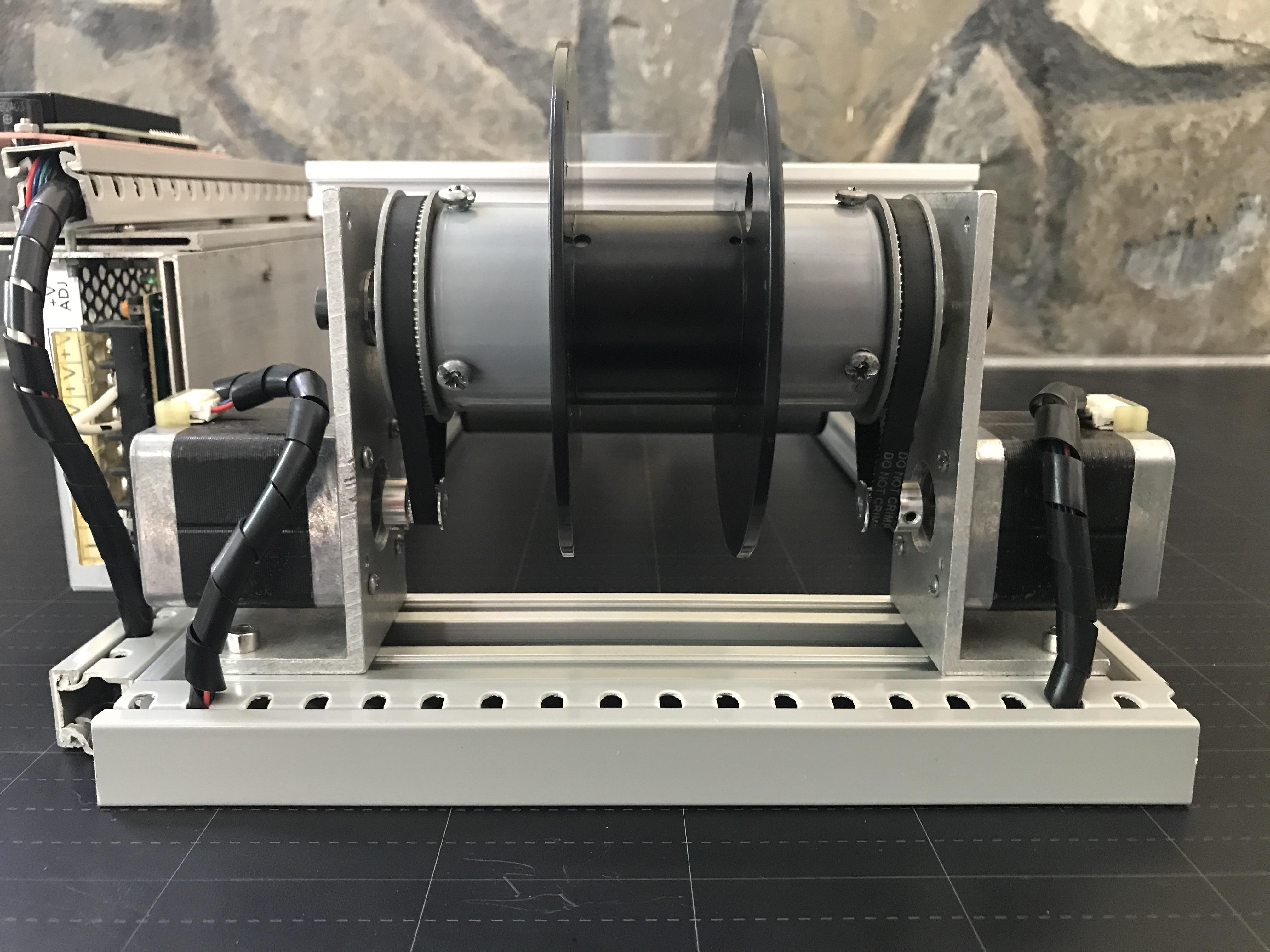 I made another one similar to this, with only 1 small filament spool for this project. My winder was driven by 2 steppers motors via GT2 6mm closed timing belts 400mm and pulley ratio 16:80.