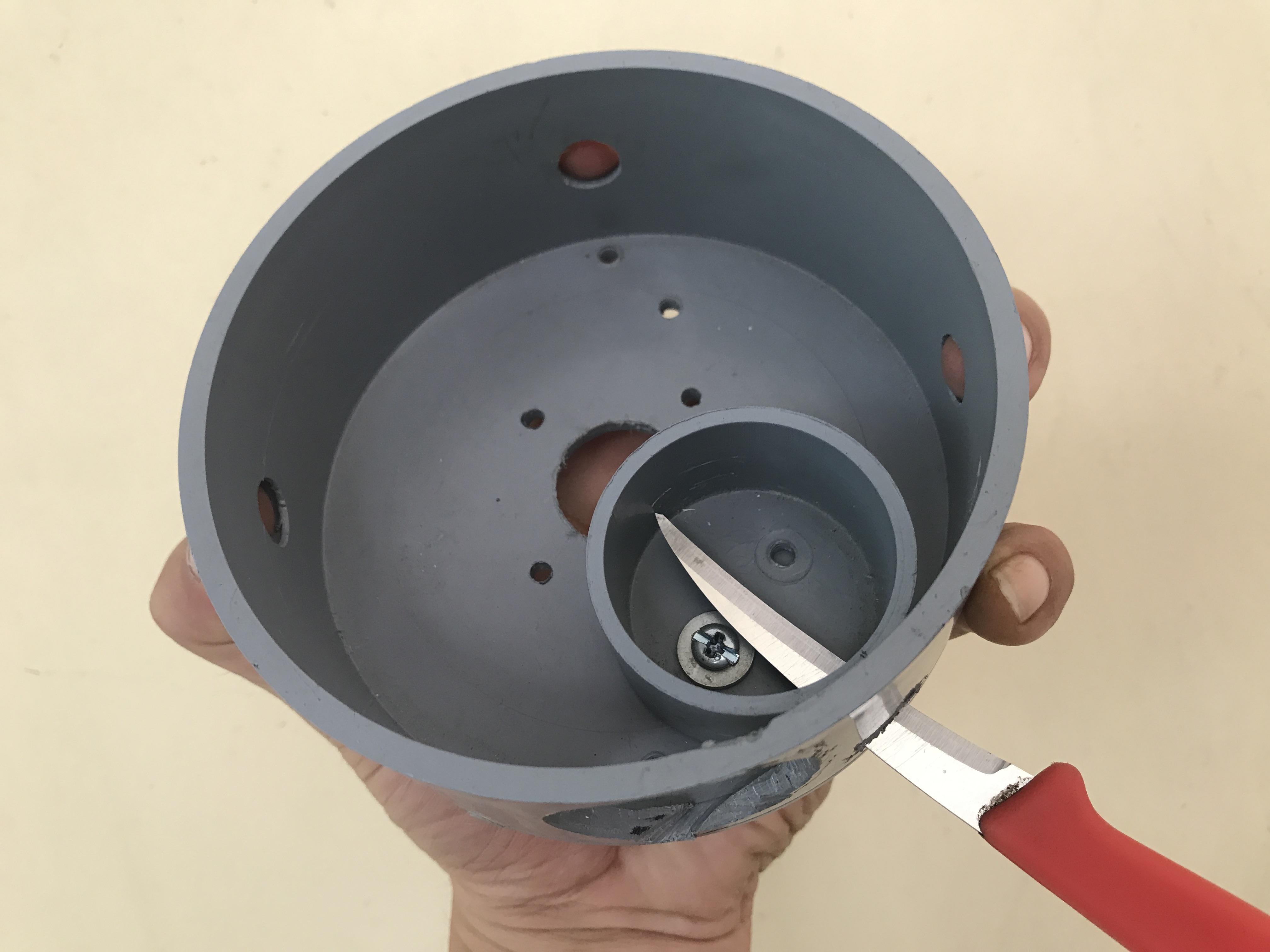 A PVC connecting pipe Ø49 has outer diameter around 58mm. So I used empty filament spools that have inner hole diameters around 58mm. Then I wrapped a layer of tape on the PVC fitting to make sure they were tight before glueing them together.