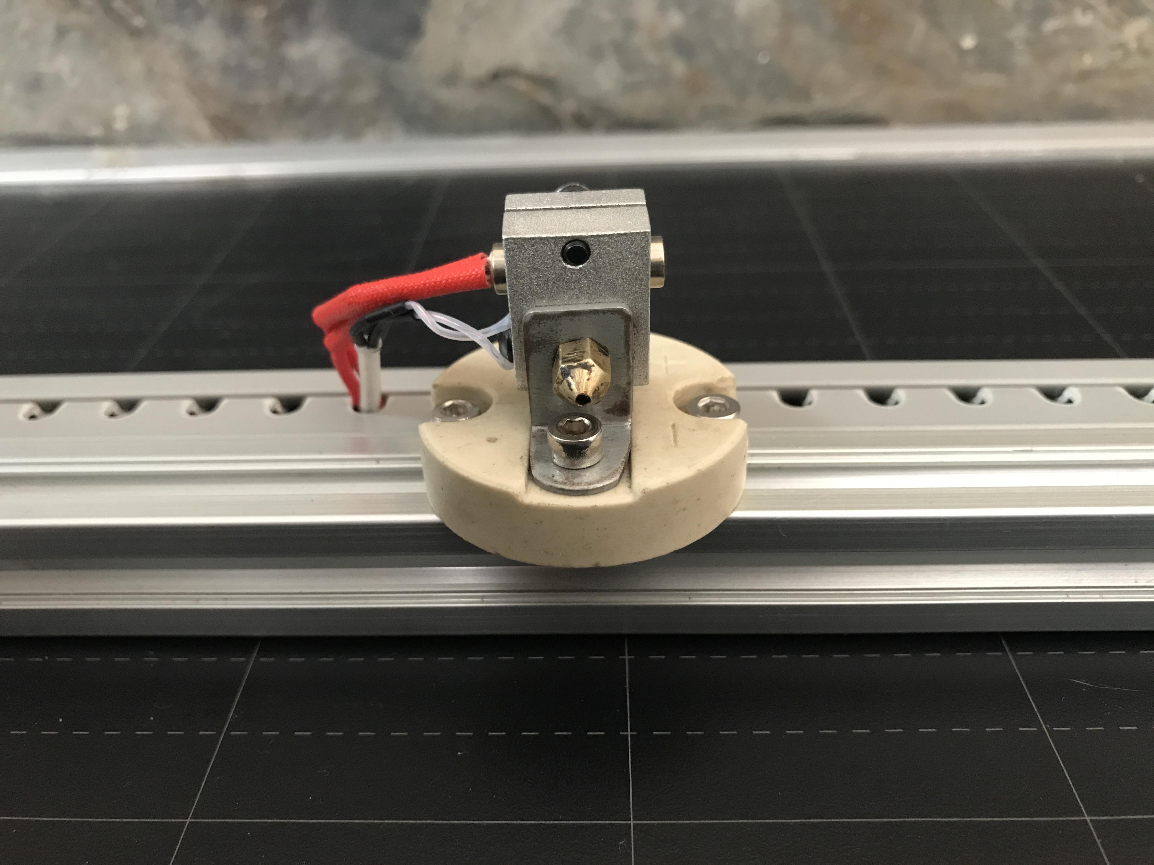 One worn-out nozzle was drilled about 1.6mm hole. To mount the hotend, I use one insulator to minimize heat transfer from bracket to aluminium profiles.