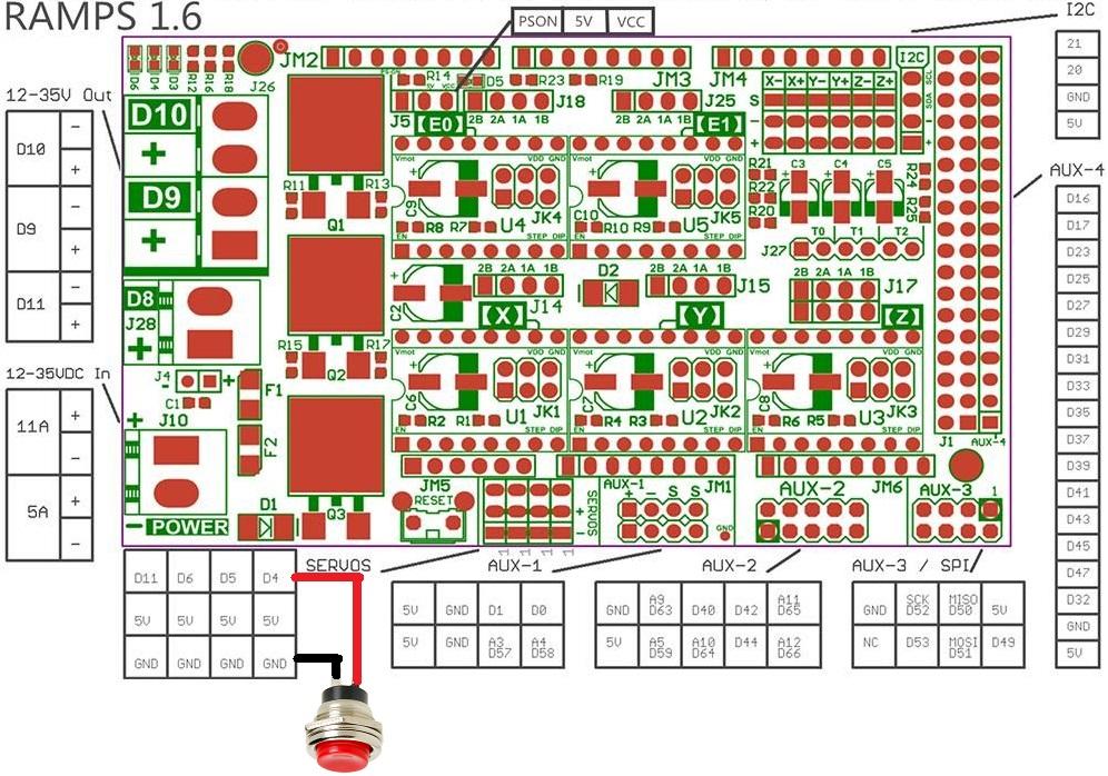RAMPS 1.6 use SERVO3_PIN for the first filament runout sensor. I connected a push button's NO contact to pin D4 and GND as shown in the picture below.