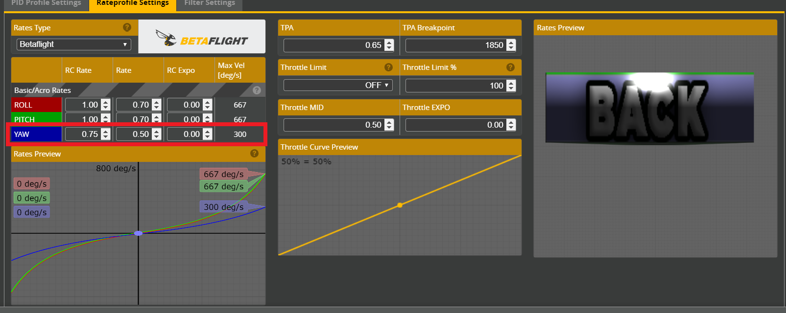 Rates are really all down to personal preference, but I got rid of most of the expo/super rate, since the boat was already prone to "snapping" on turns as soon as the edge dug in, I also reduced the rates dramatically, since 300deg/s seemed more than enough for a surface vehicle, but experiment and see what you like!