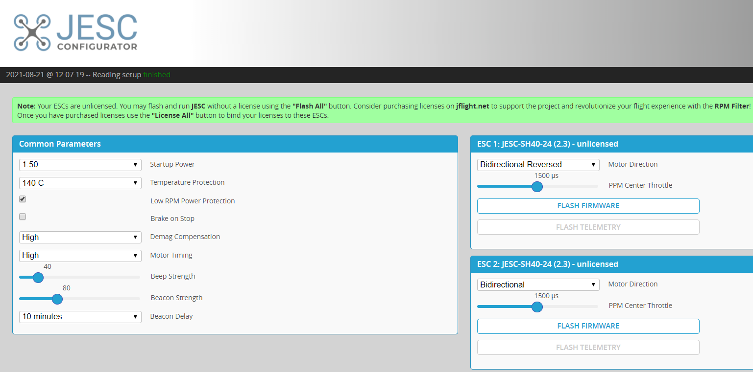 - Record which motor number corresponds the left-hand motor, and which to the right. Assuming there are only two motors connected there will be two channels that do nothing in a default quad-x config.