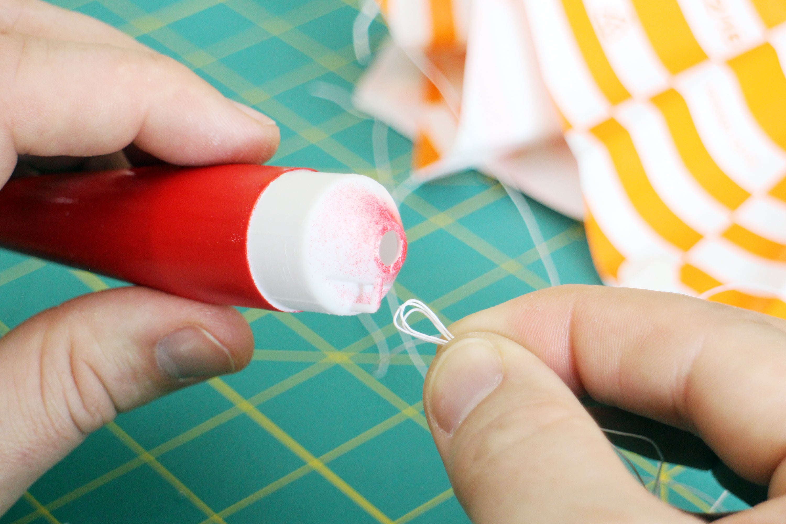 With the hook in place, put a small dab of glue just above the 2nd marking (16mm from our reference end).