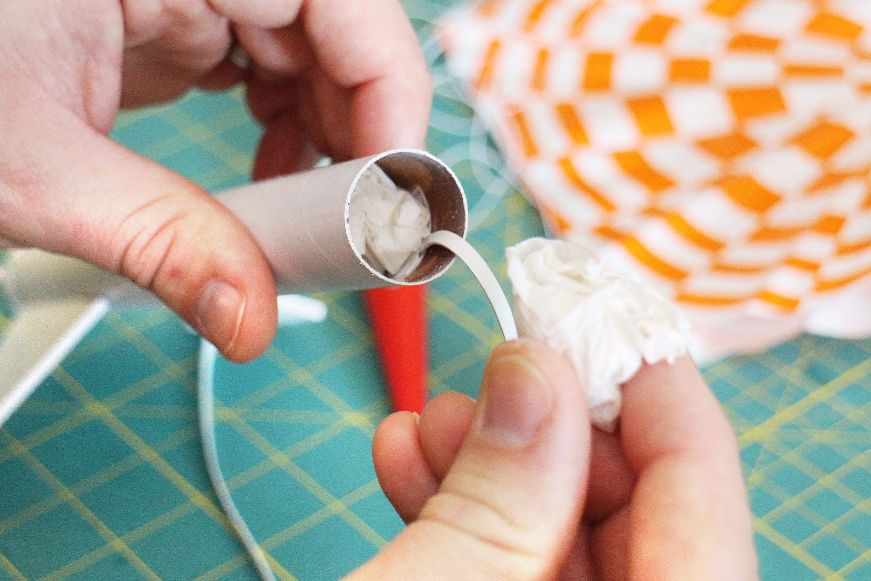Before stuffing the parachute into the fuselage, we need to add some wadding. Wadding will helps control the blast that will push the nose cone outwards, ejecting the parachute. Without wadding, the blast can melt the parachute and prevent any controlled descent.