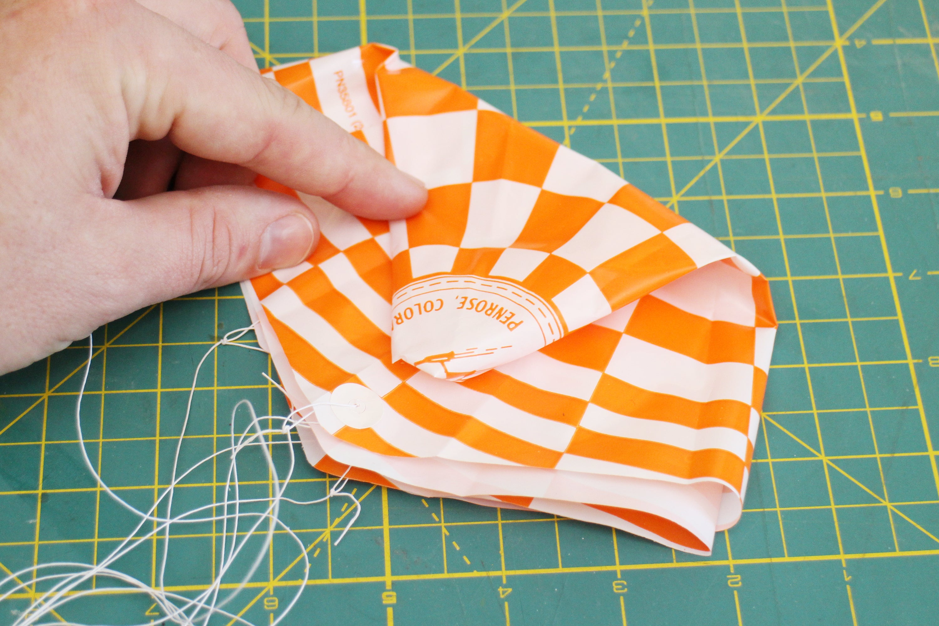 Lay the parachute flat, fold over lengthwise, then wrap the edges inwards to make a tube shape. Insert the folded parachute into the fuselage and close the rocket up with the nose cone.