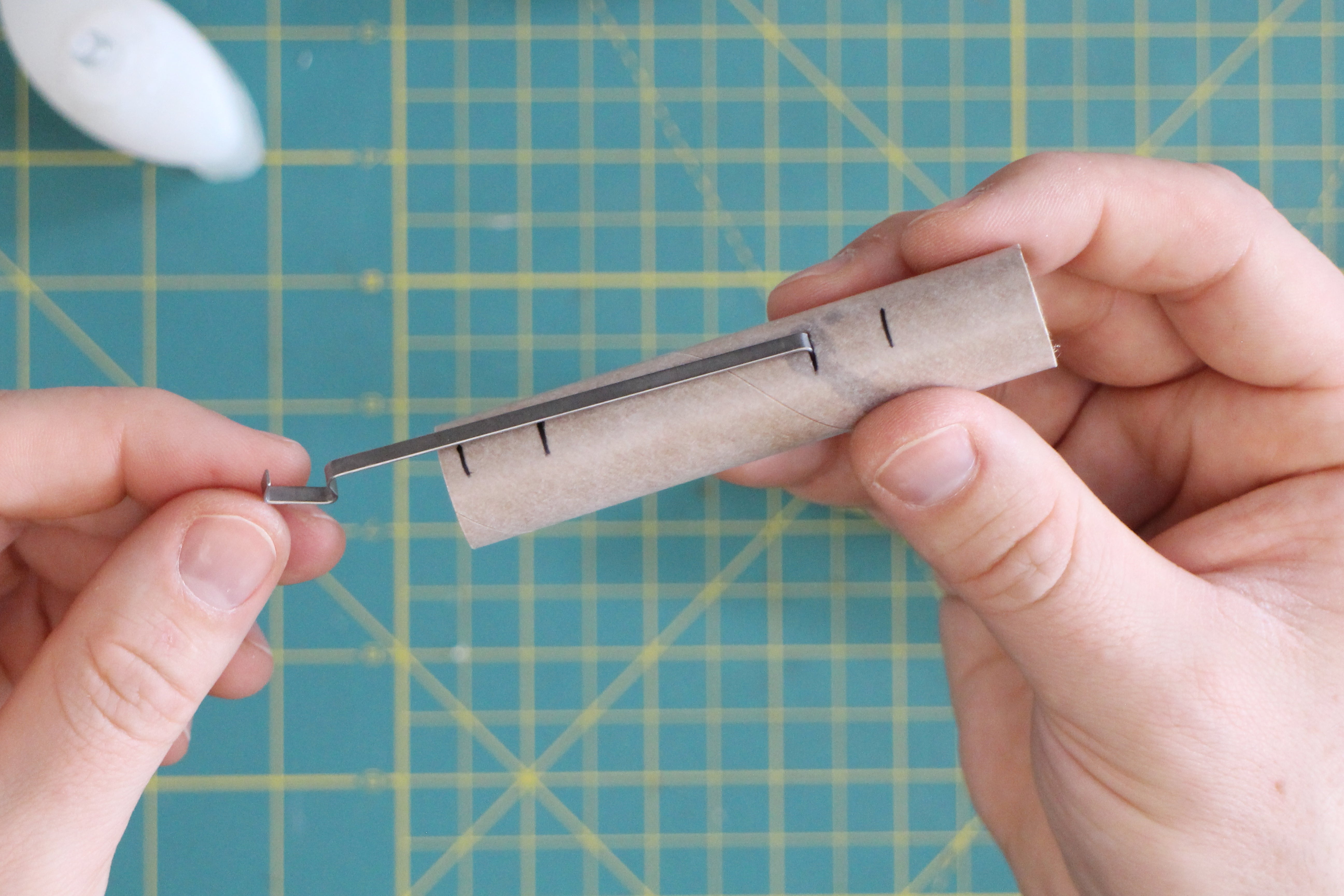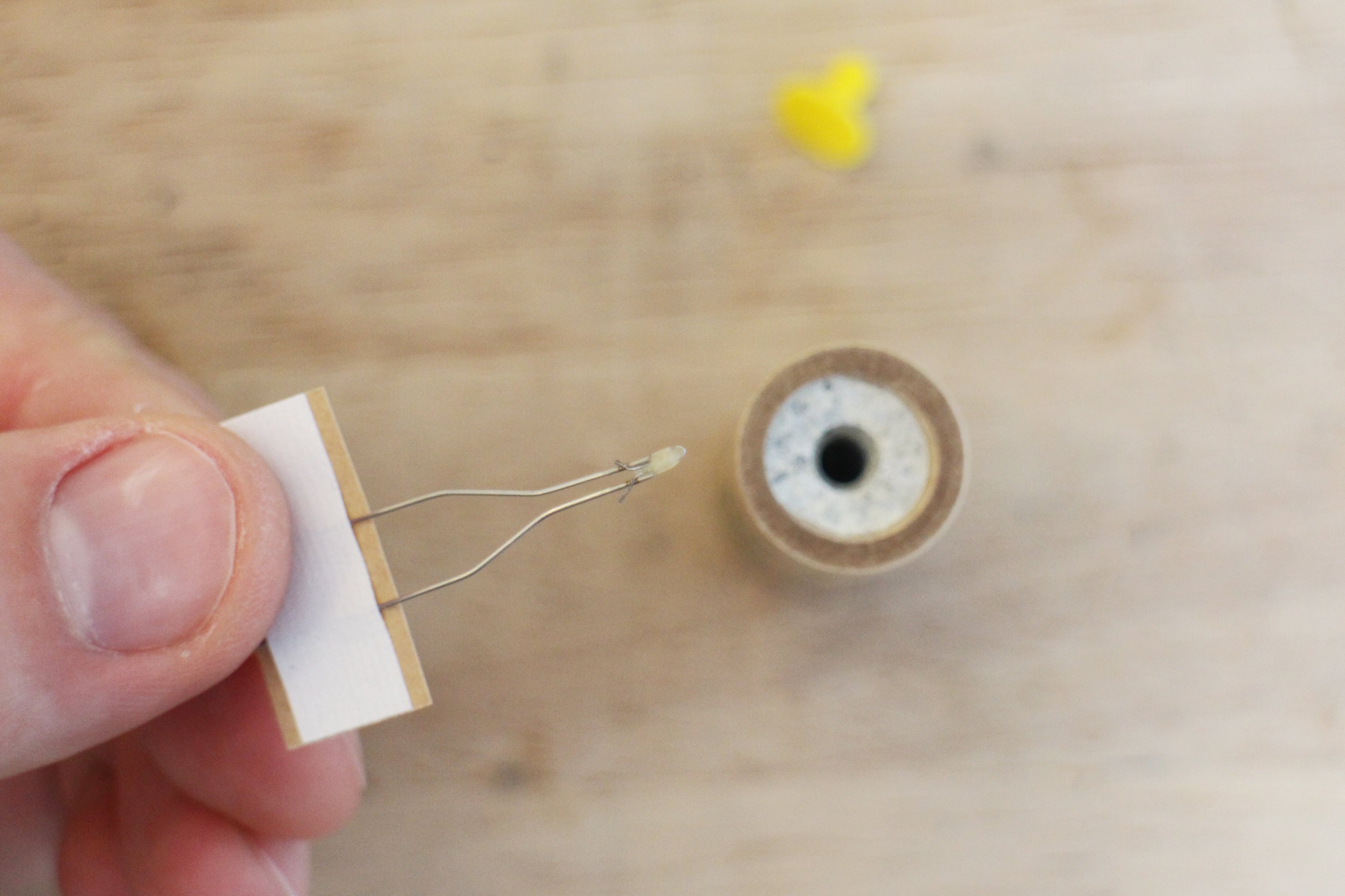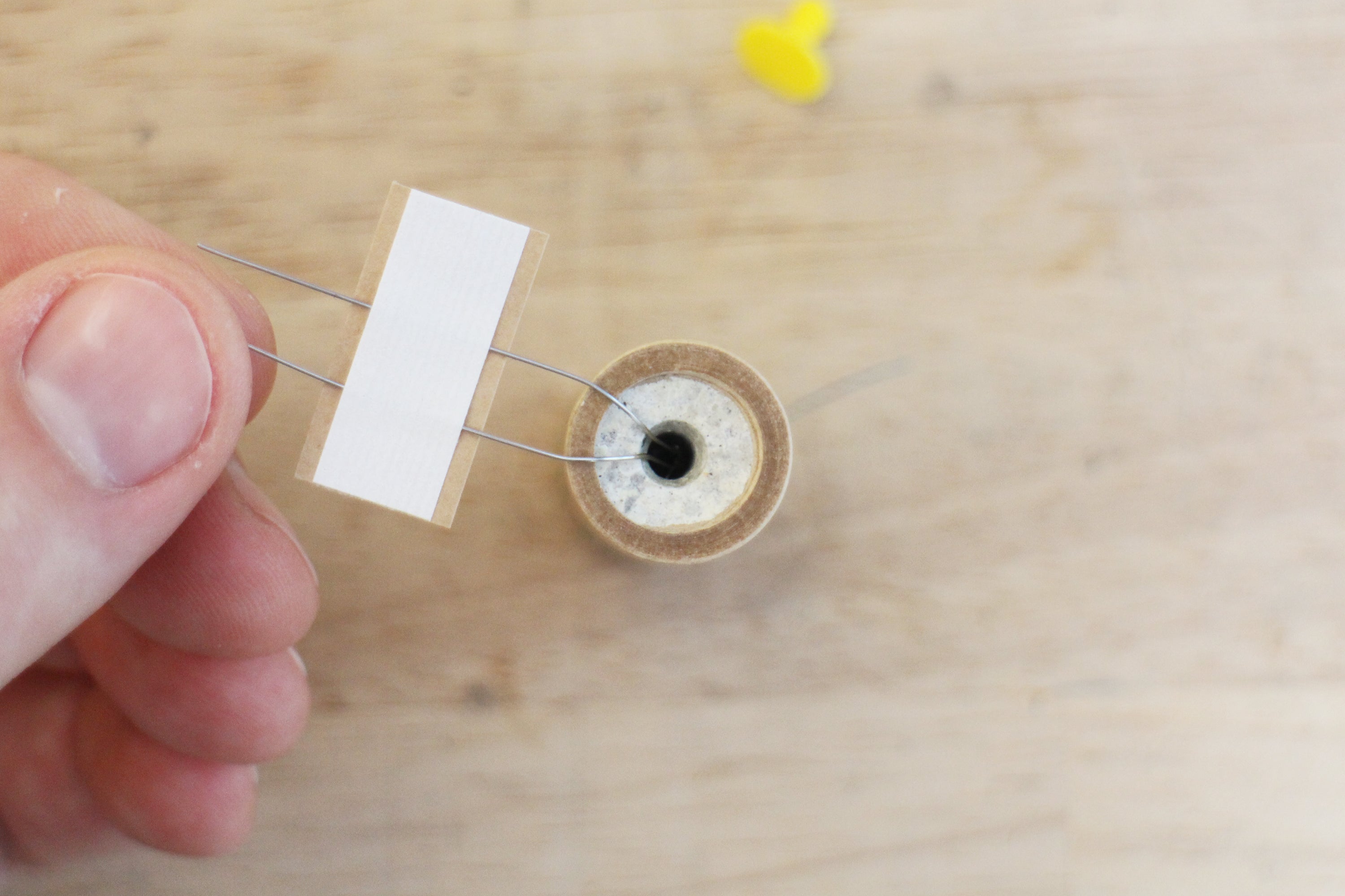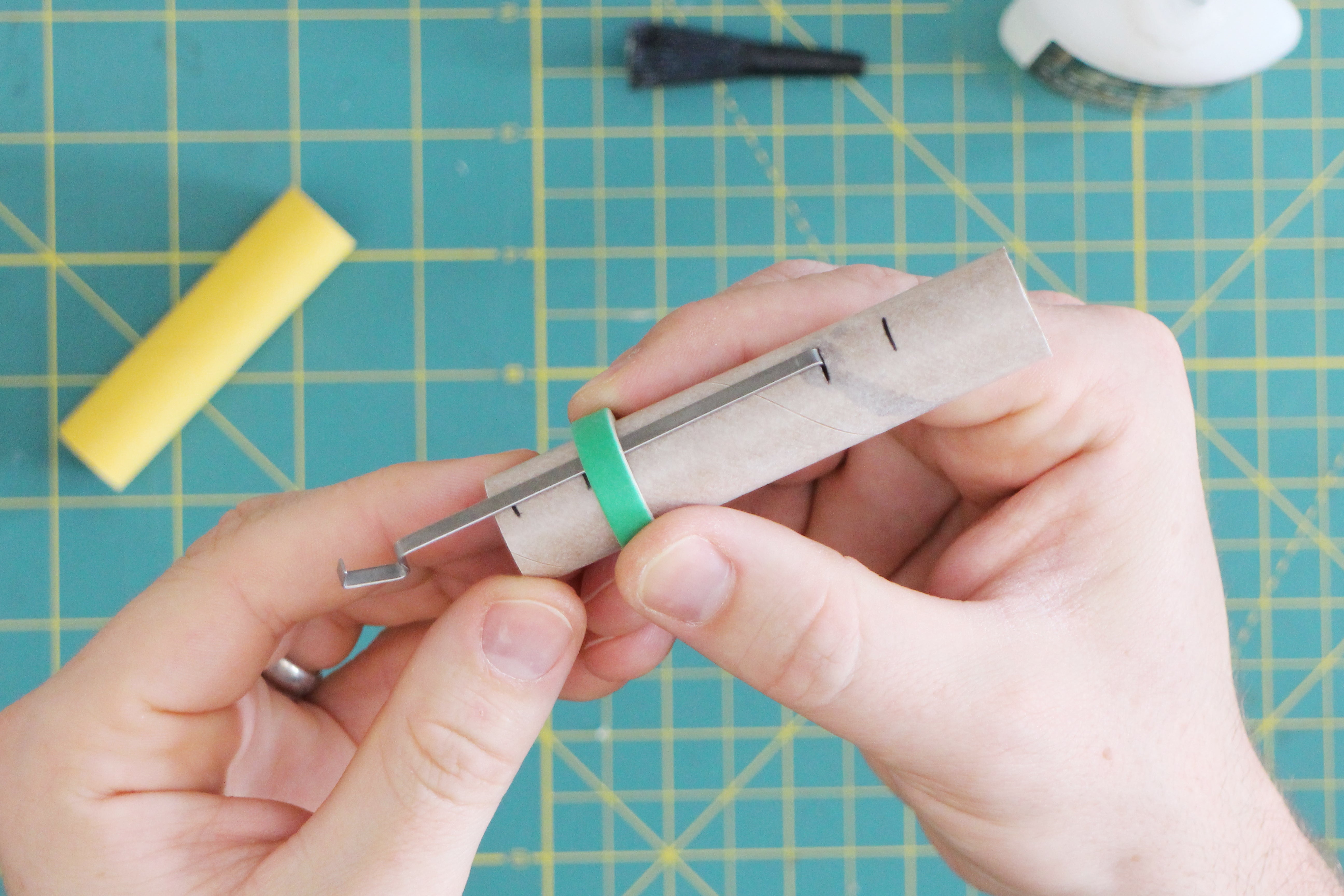 Gently push the small spacer ring down the brown tube until you reach the mark on the yellow tool. From the other open end of the brown tube, use a think craft or bamboo stick to add a small dab of glue to hold the spacer ring in place. Make sure to remove the yellow tube quickly after applying the glue to ensure you don't accidentally glue the yellow tube inside.