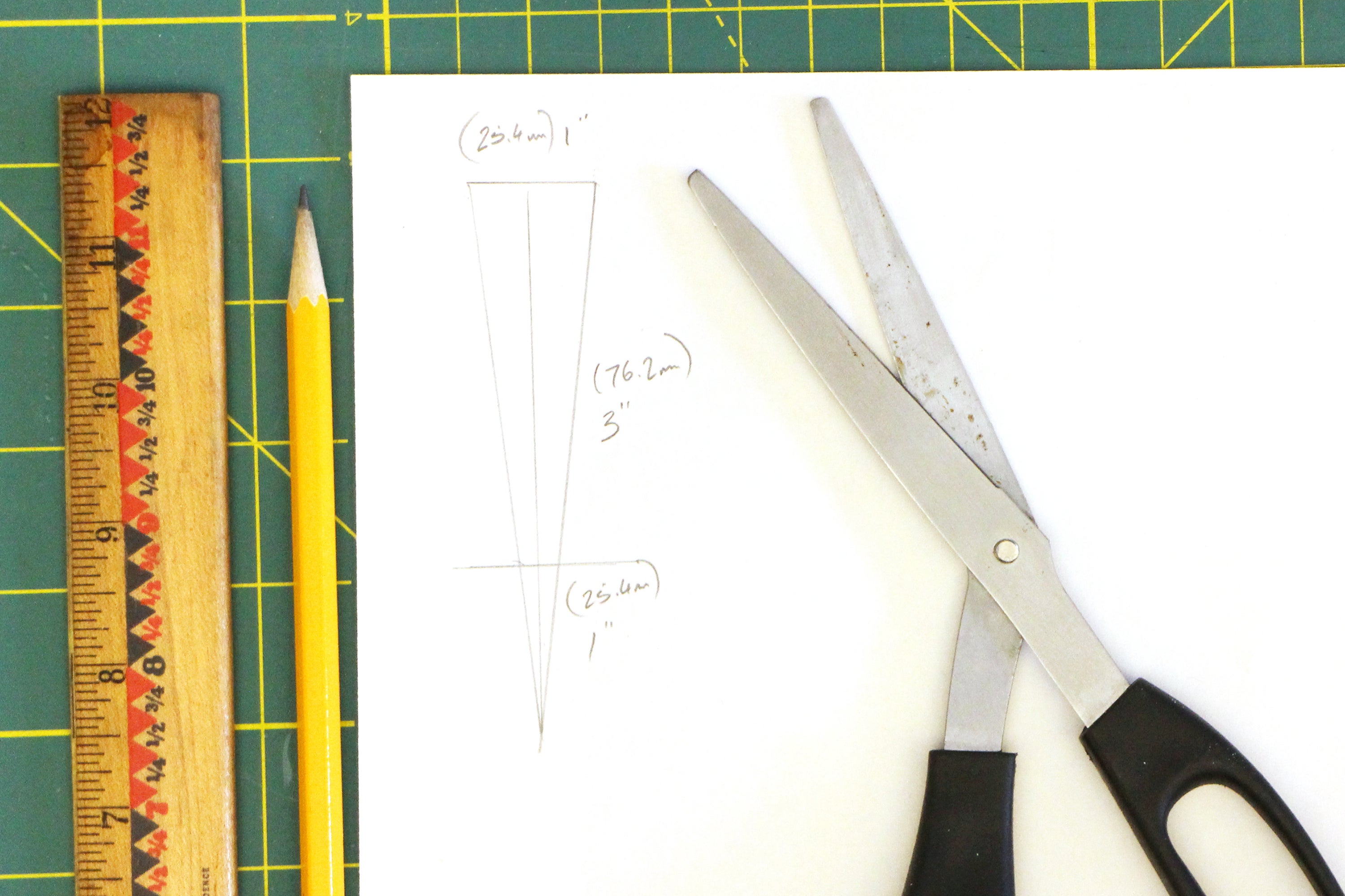 The dimensions aren't critical as we're only going for a general shape. Roughly, the dimensions I used for my T-shape were 1" (25mm) for the top bar, and 4" (100mm) for the leg. Once you have a triangle shape cut it out with scissors Then clip off the sharp point of the triangle, about 1" up from the point.