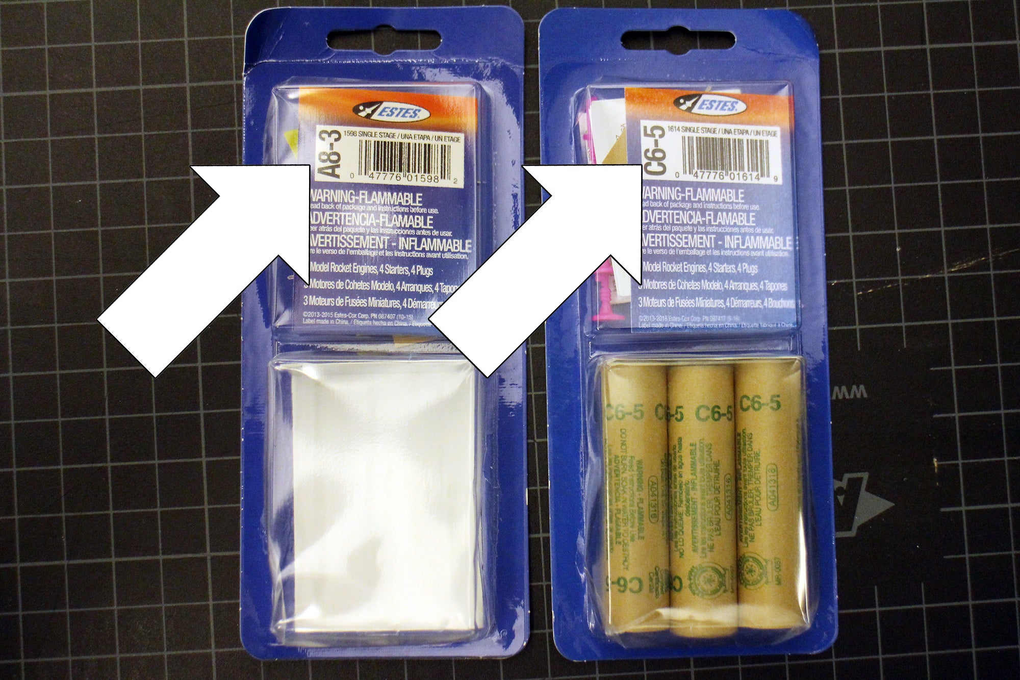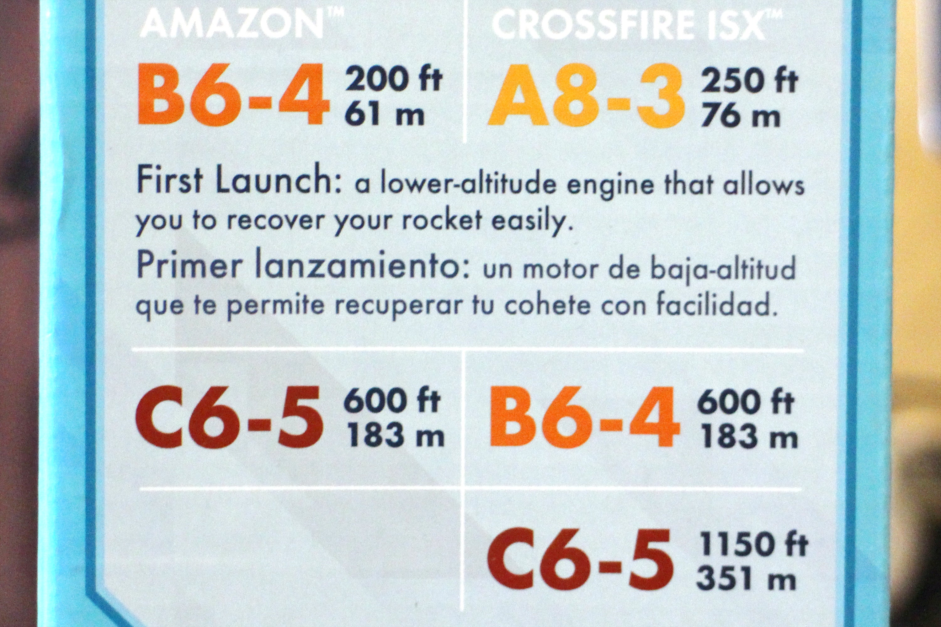 All rocket engines have their 3-part code (letter-number-number) clearly printed in a colored ink, and be visible on both the rocket engine and packaging. You can lookup more data on every type of rocket on the NAR website. For this introductory lesson, we're using low-powered 'A' class rockets.