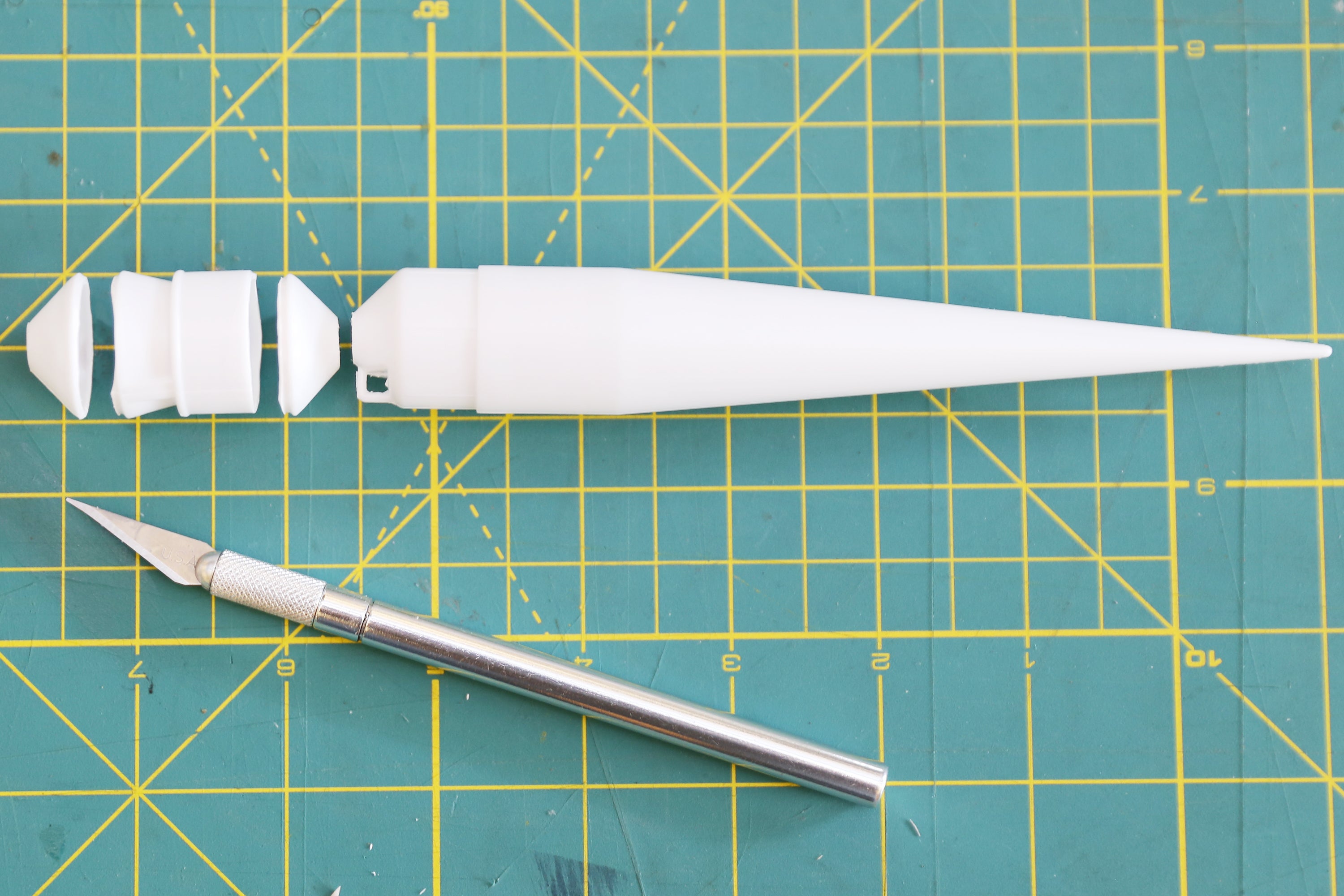 Though the plastic isn't thick, it can sometimes be difficult to separate the nose cone and engine nozzle. To separate mine, I used a sharp hobby knife to pierce the plastic connection and carefully work the blade around the circumference of the narrowest part of the back end of the nose cone.