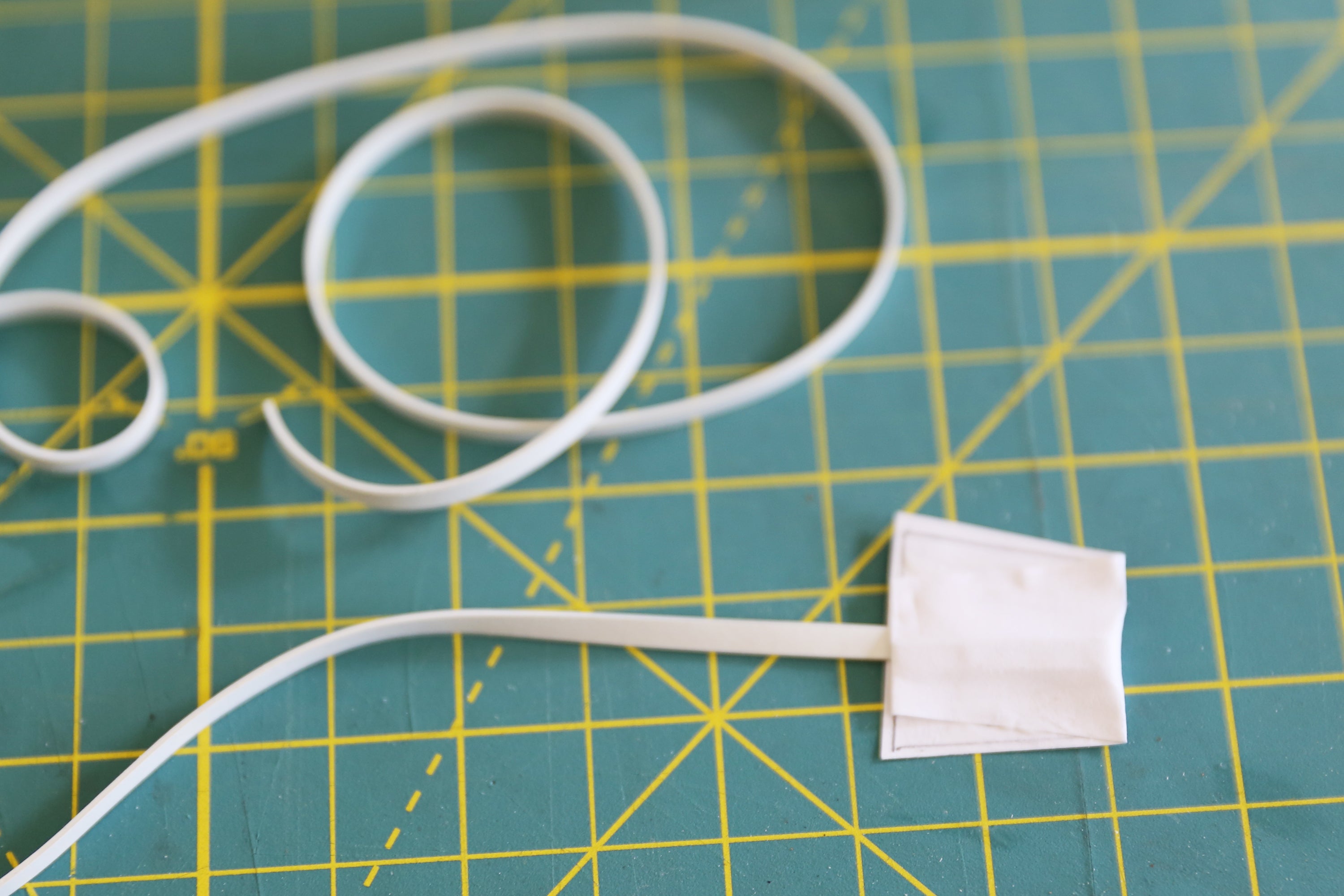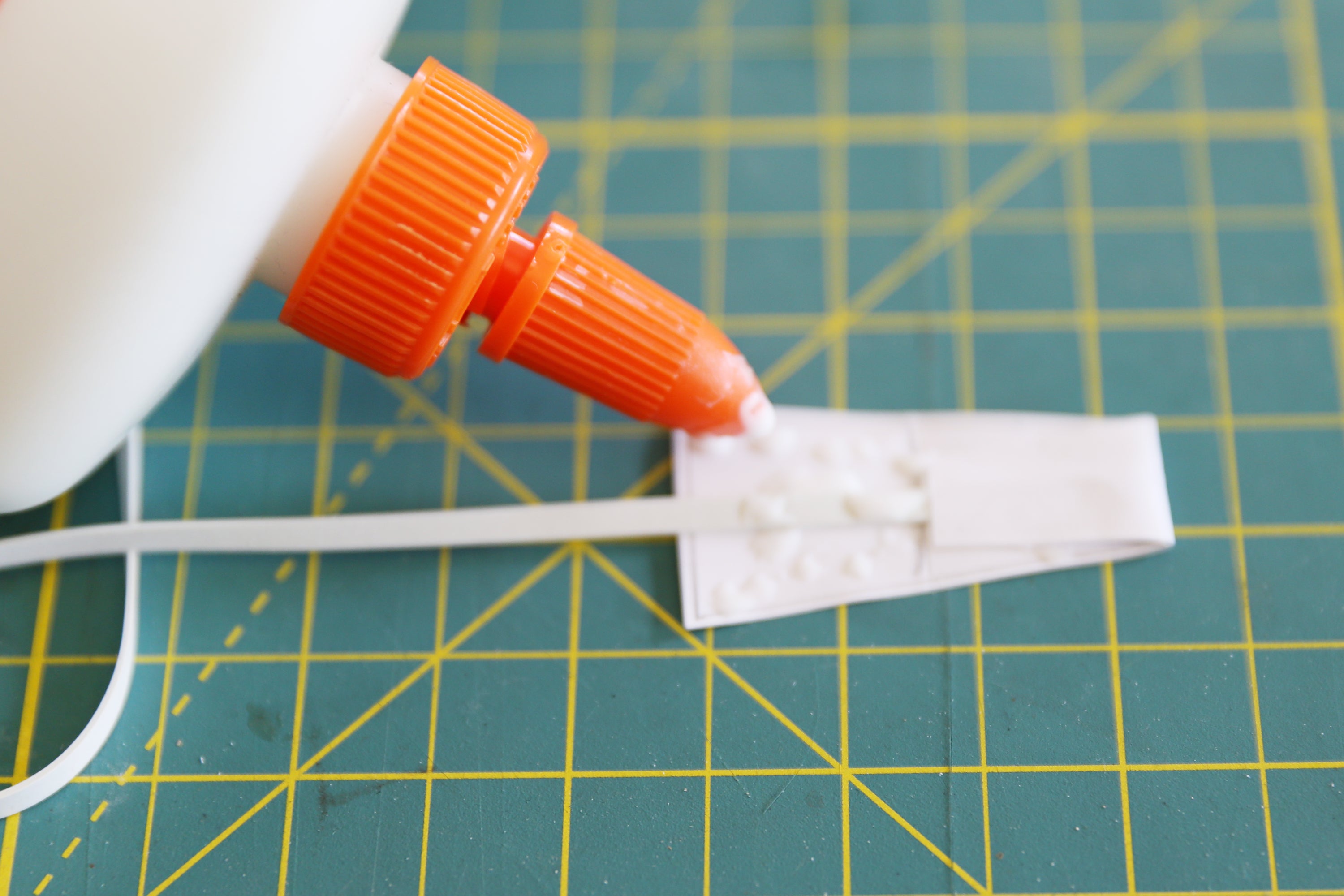 Place one end of the shock cord in the middle section of the paper mount. Then apply a dab of glue and fold down the thinner top section of the mount to seal in the end of the cord. Press firmly to secure the end of the cord in a paper sandwich.