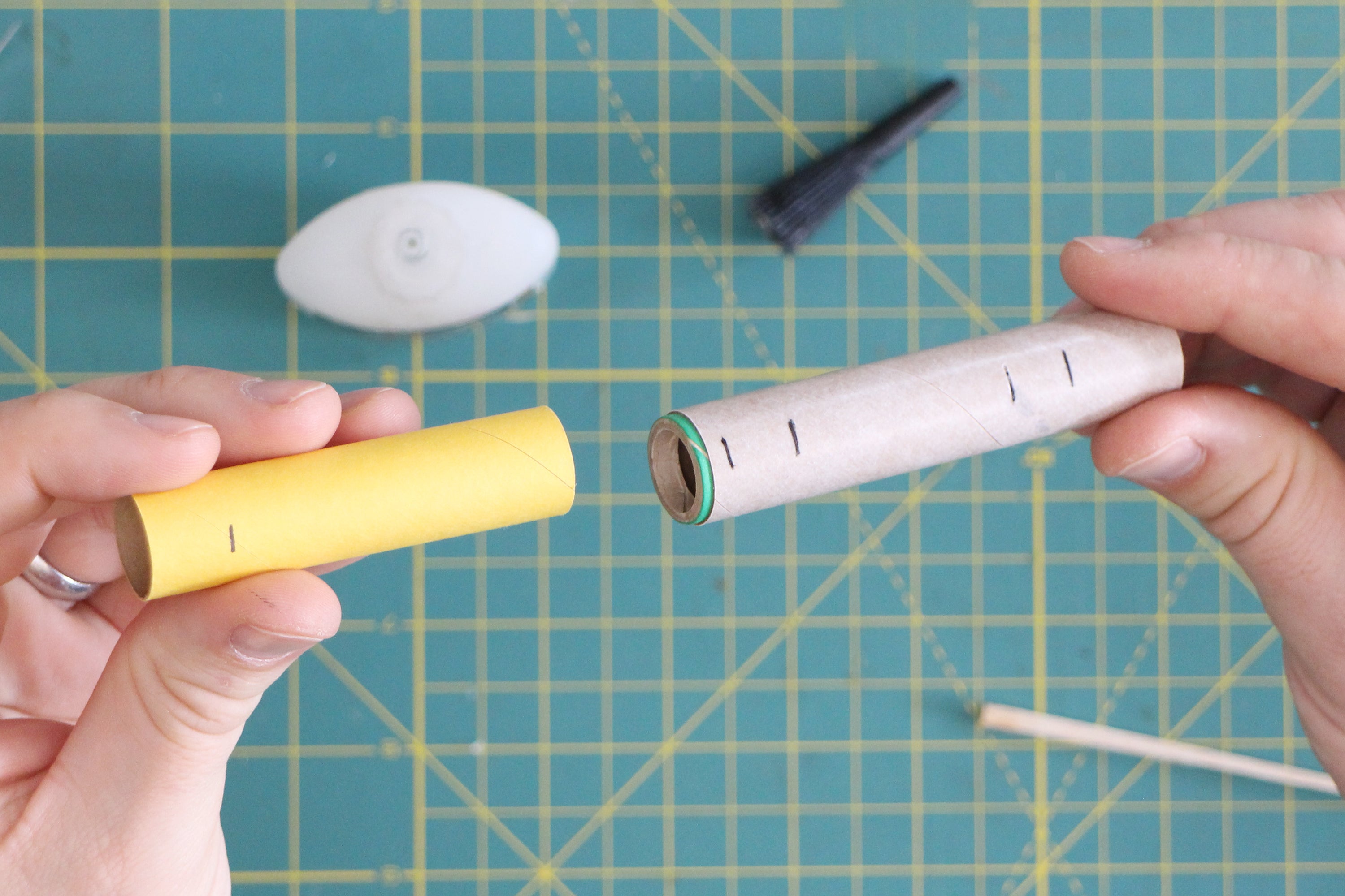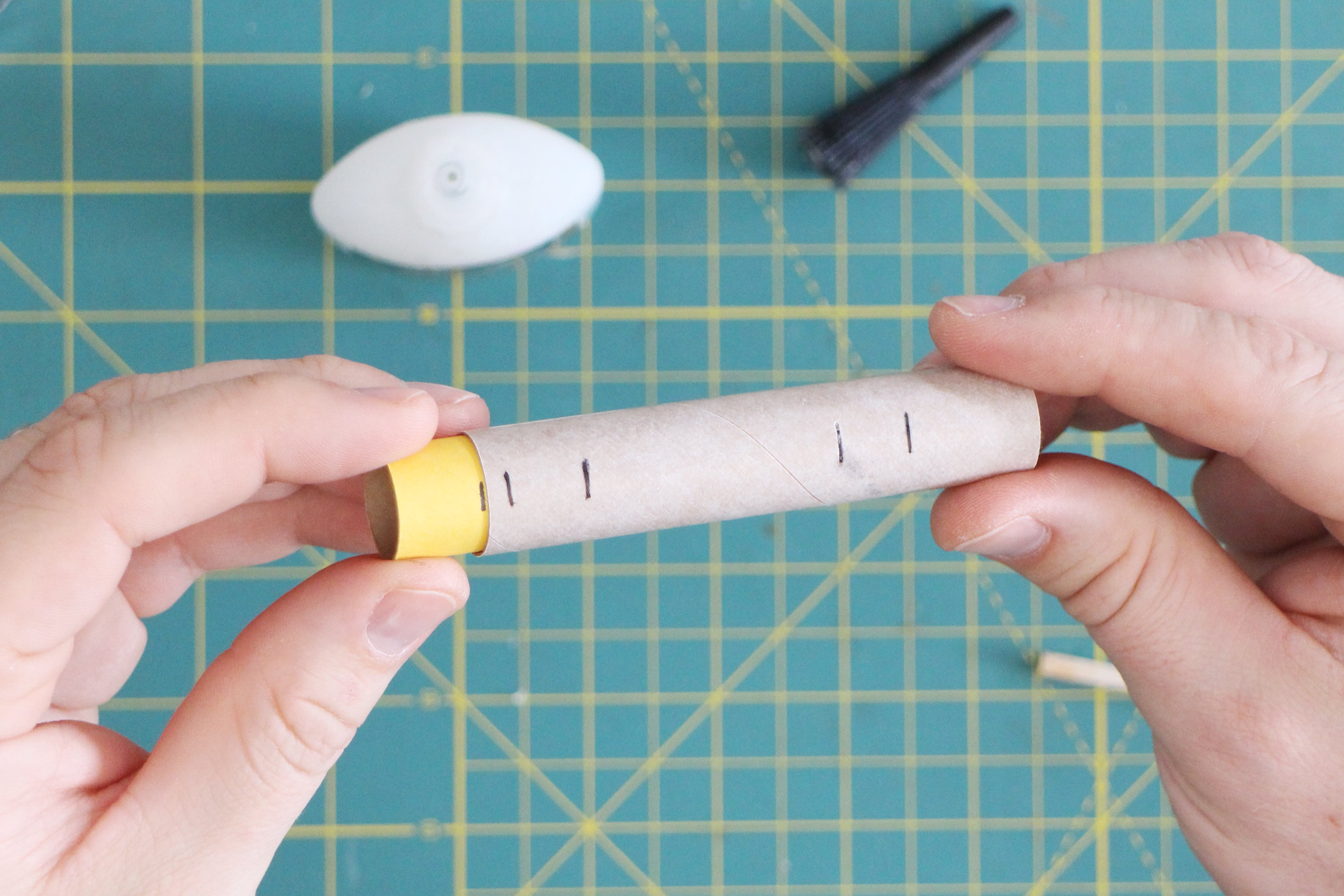 The yellow spacer tool is the exact size of the rocket engines we'll be using and slides perfectly inside the engine mount tube. We'll make a mark at 13mm from one end,. This mark will help us accurately place a spacer inside the engine mount.